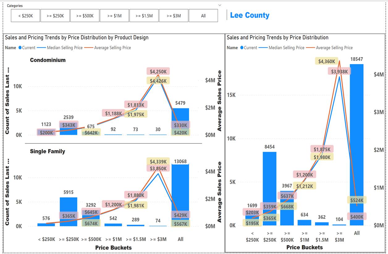 This set of graphs show the distribution of sales by price bucket or range. The ranges are; Less than $249K, $250K to $499K, $500K to $999K, $1M to $1.49M, $1.5M to $2.9M and Greater than $3M. The lines show the Median and Average Price of sales within each price range. This information provides insights into what price range is the most demanded in the market.