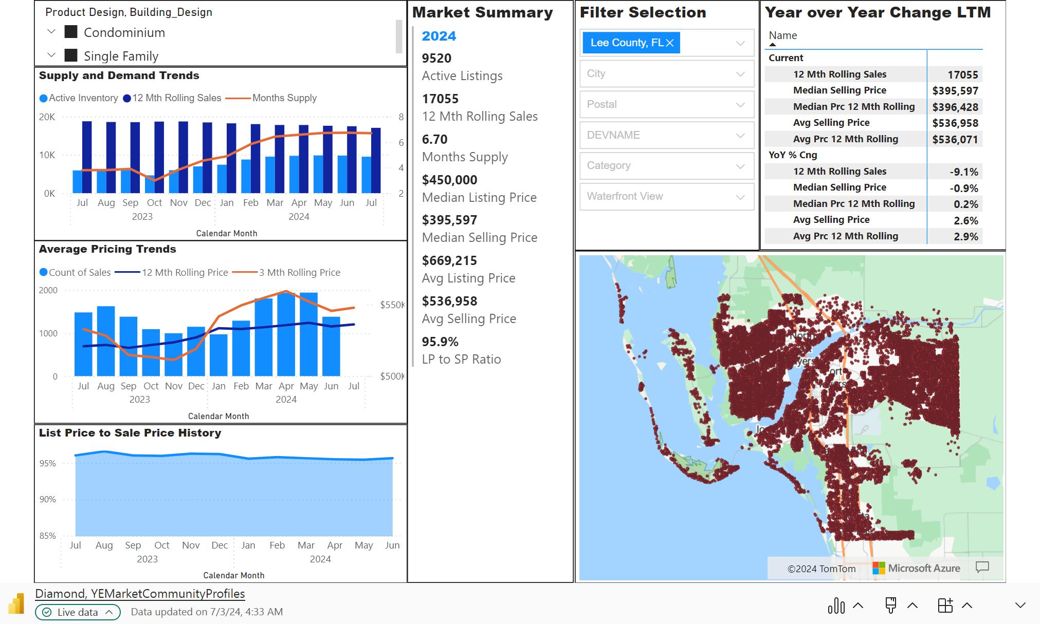 • As of July 1, 2024, the average monthly supply of housing units in Lee County remained unchanged from the prior month at 6.45 units. The current 3-month moving median price trend for July 1, 2024, was $399,500, compared to $402,500 in July 2023. The 3-month rolling average price on July 1, 2024, was $545,000, unchanged on June 1, 2024, and up from the $533,000 in July 2023.