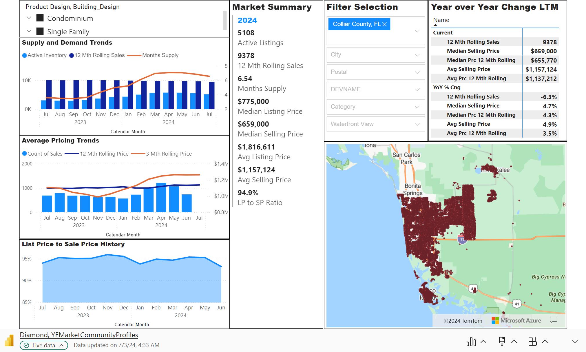• Collier County's average monthly housing supply was 6.54 on July 1, 2024, slightly lower than the prior months at 6.83 months supply. The current 3-month moving median price trend for July 1, 2024, was $686,000, compared to $651,000 on July 1, 2023. Median 3 Mth rolling pricing increased by 4.4% on July 1, 2024, compared to 3.75% in the same month the previous year, while the 3 Mth rolling average price increased by 13.5% on July 1, 2024, compared to 0.3% in the same month the prior year.
