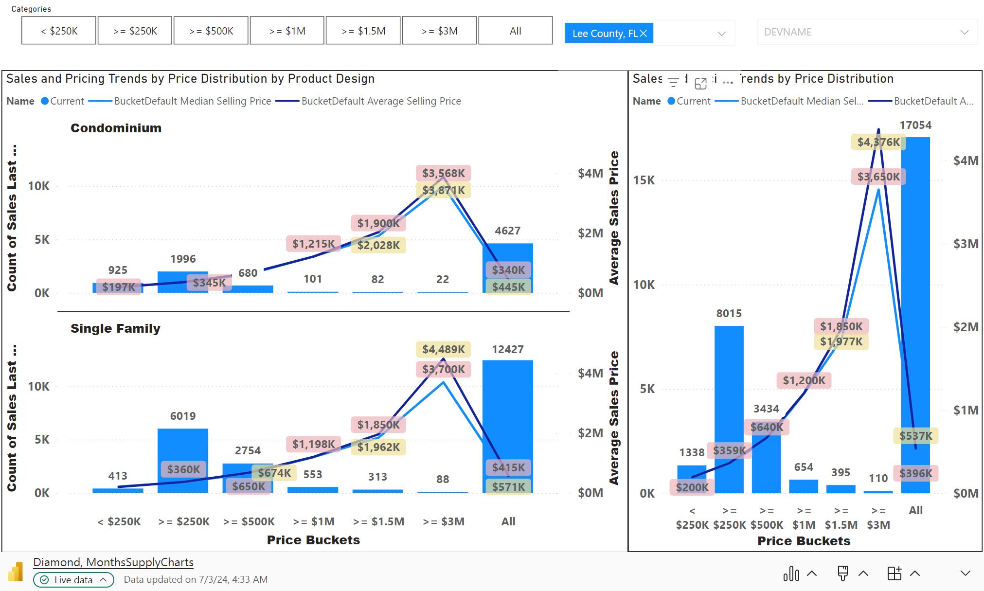 1. Sales and Pricing Trends by Price Distribution by Product Design (Condominium) – The blue bars show the number of sales that occurred over the last 12 months in each price band. The blue line shows the median sale price for each price bucket. The orange line shows the average sale price for each price bucket.