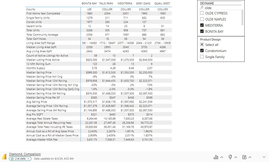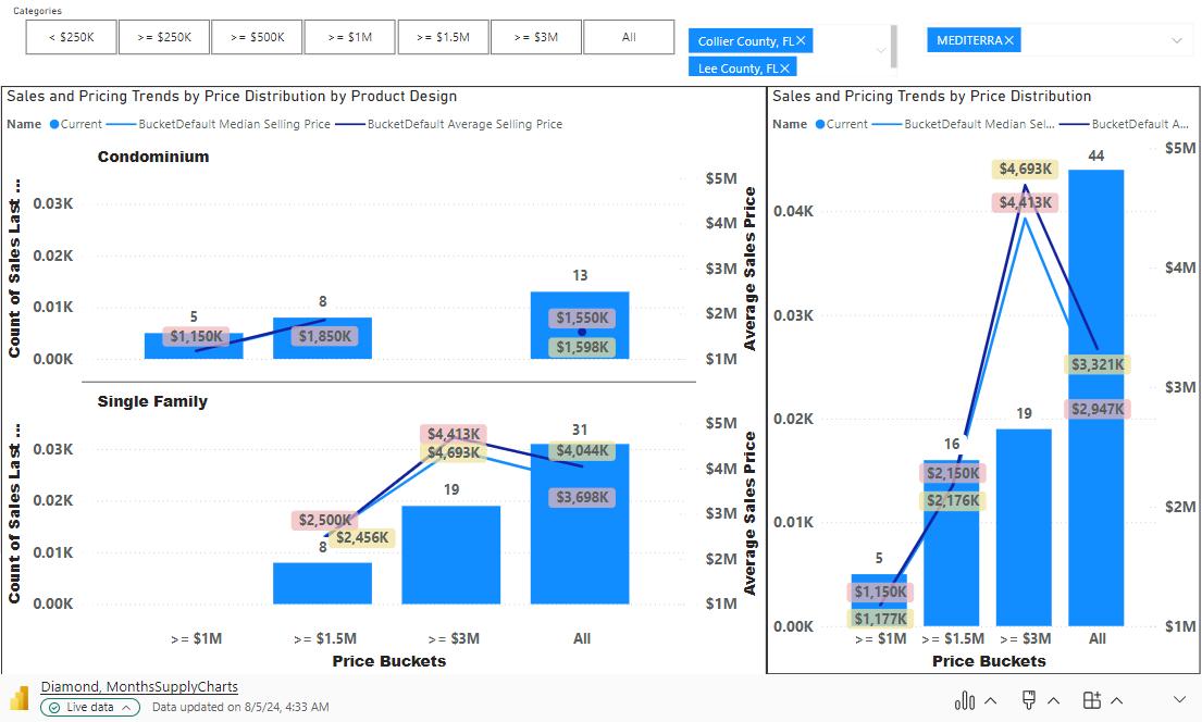 1. Sales and Pricing Trends by Price Distribution by Product Design (Condominium) – The blue bars show the number of sales that occurred over the last 12 months in each price band. The blue line shows the median sale price for each price bucket. The orange line shows the average sale price for each price bucket.