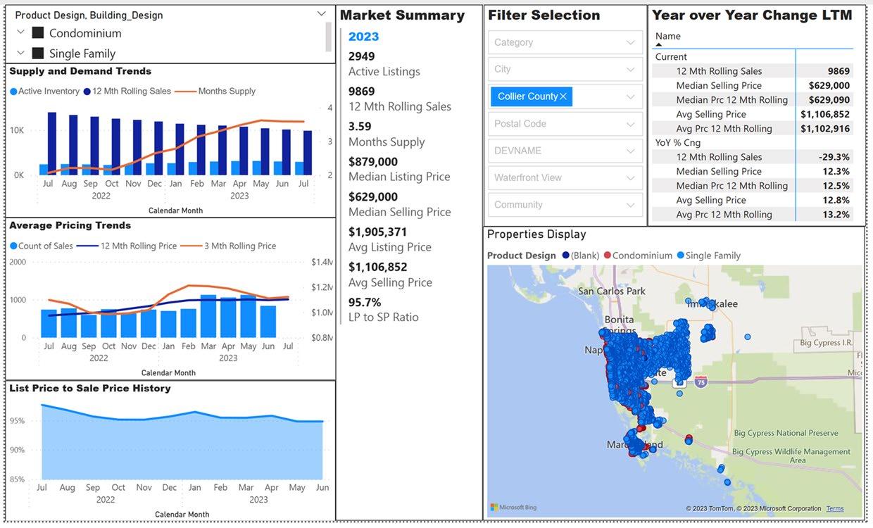 2. Month over Month Change in Median Selling Price by Month and Year – This waterfall chart shows the monthly change in the 3 month median sales price. Each month is color coded Green if the change is positive and Red if the change is negative. The solid blue bar on the right of the chart shows the total percentage change in median pricing from January 2020 to the current month. Understanding the trend in monthly change in median pricing provides insights into the long term direction of pricing and can help explain and measure how price changes are impacted by economic or weather events. In this case, the downward trend reflected the impact of Hurricane Ian on the residential real estate market.