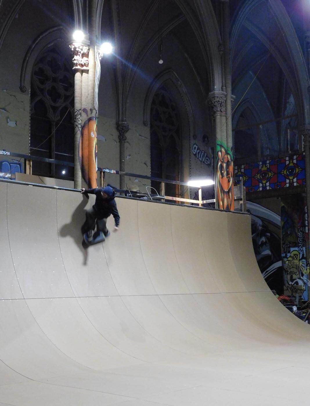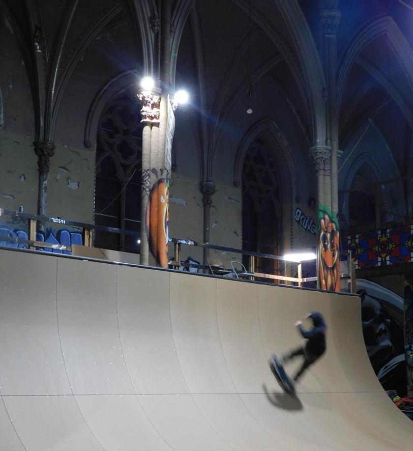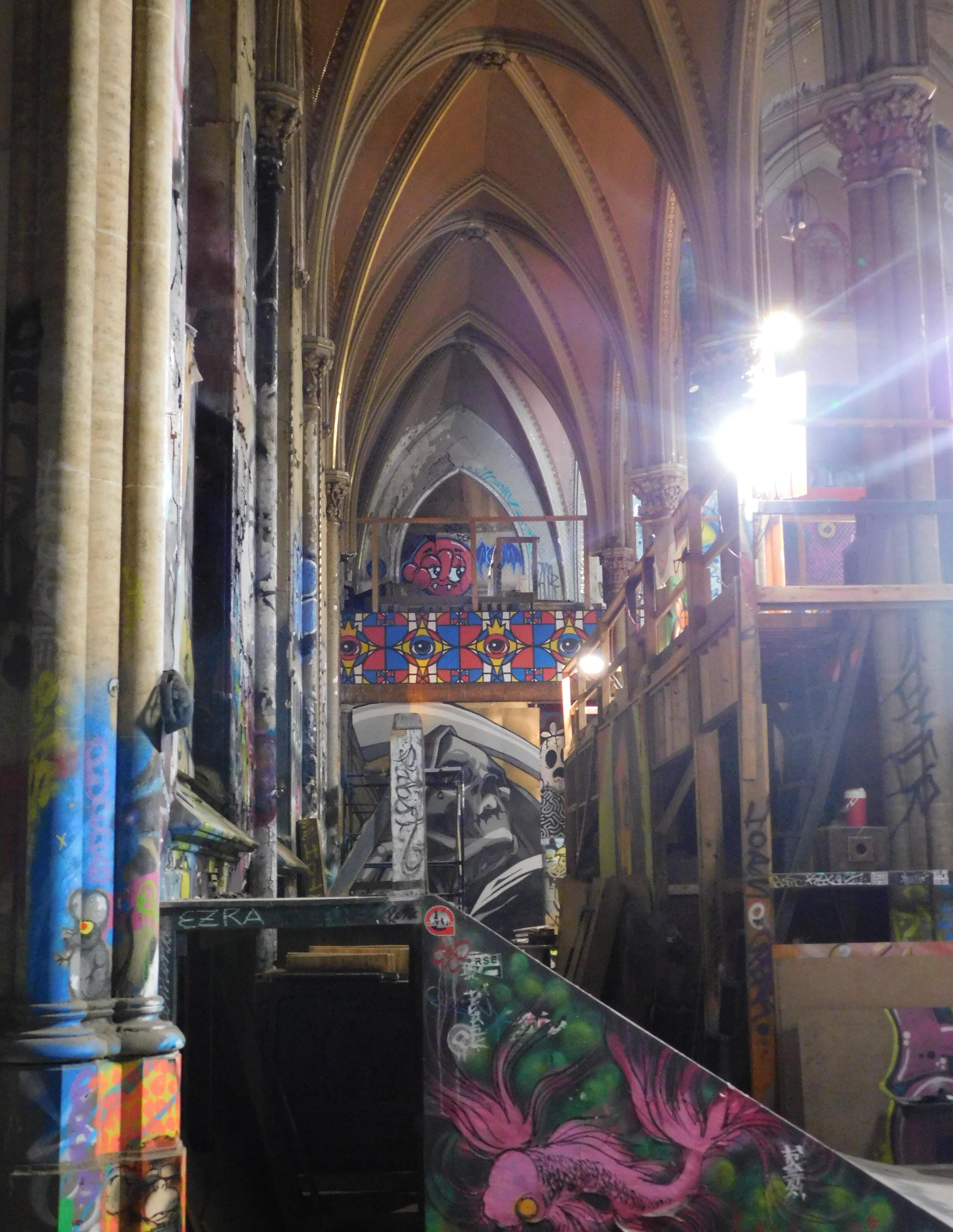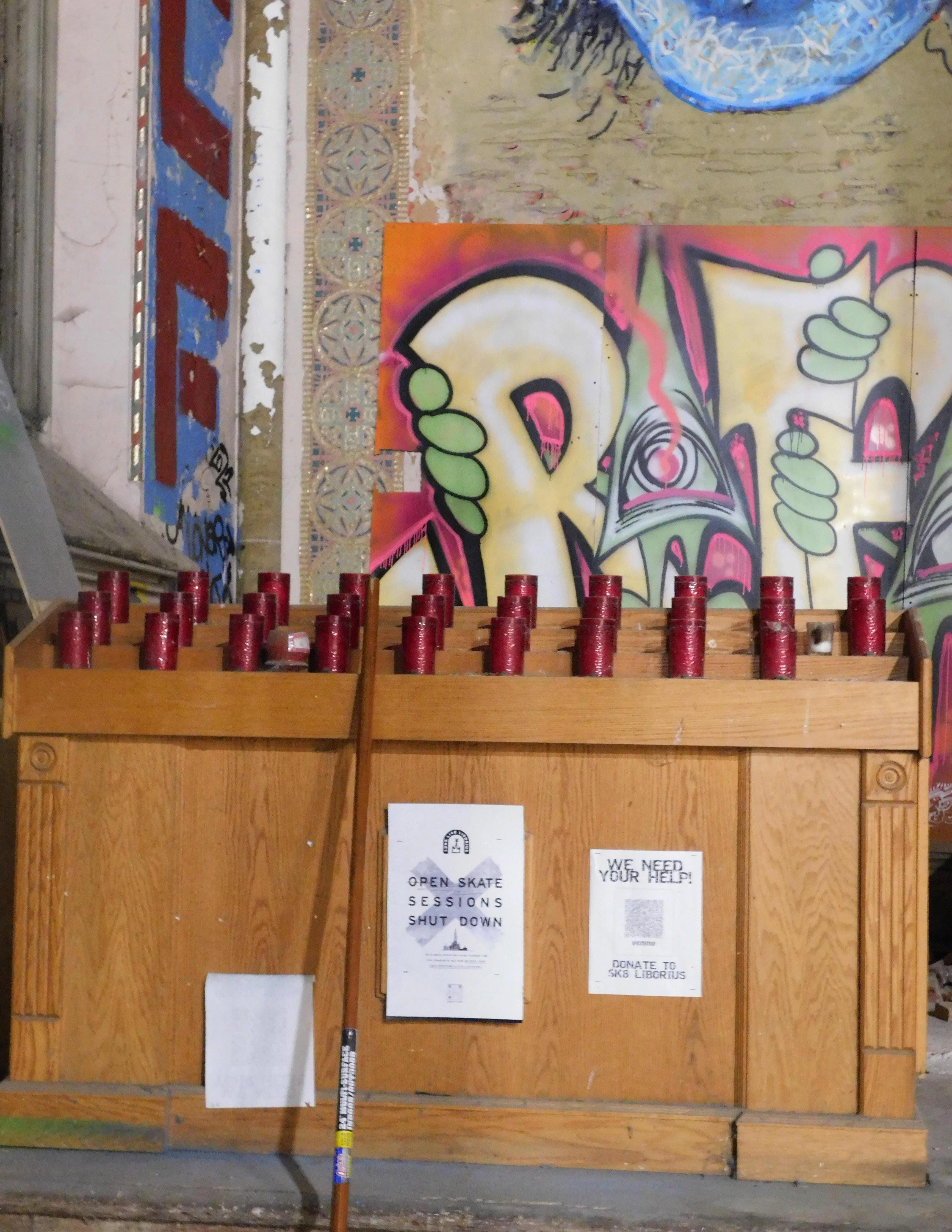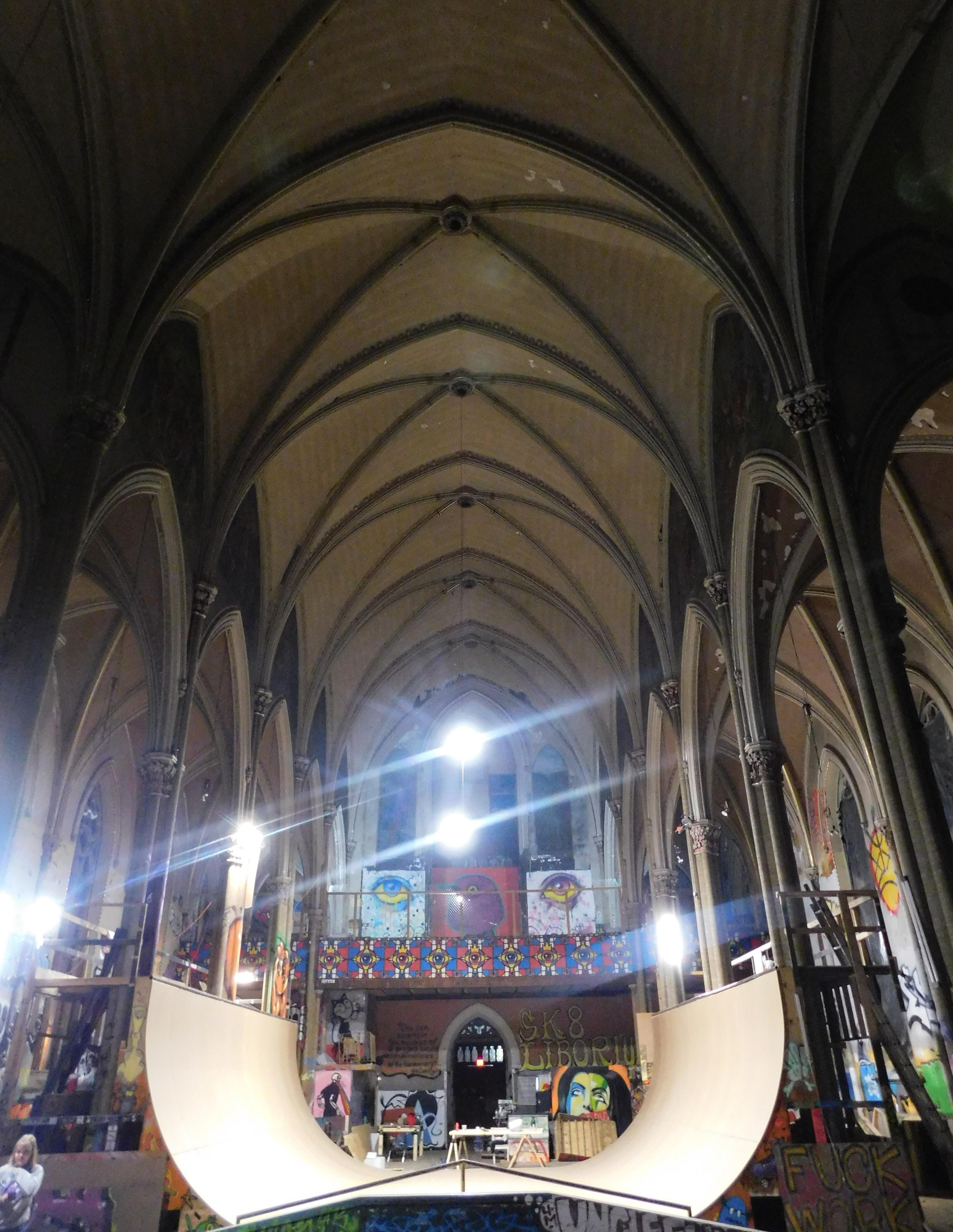Iwas greeted at the Sk8 Liborius Church by founder Dave Blum, and his two-year-old daughter who rode on his shoulders. It is hard to not be awe struck by the beauty of it all: the towering spire piercing the night sky, the massive doors that open up to a world of reinvention, the sprawling colors of graffiti art.