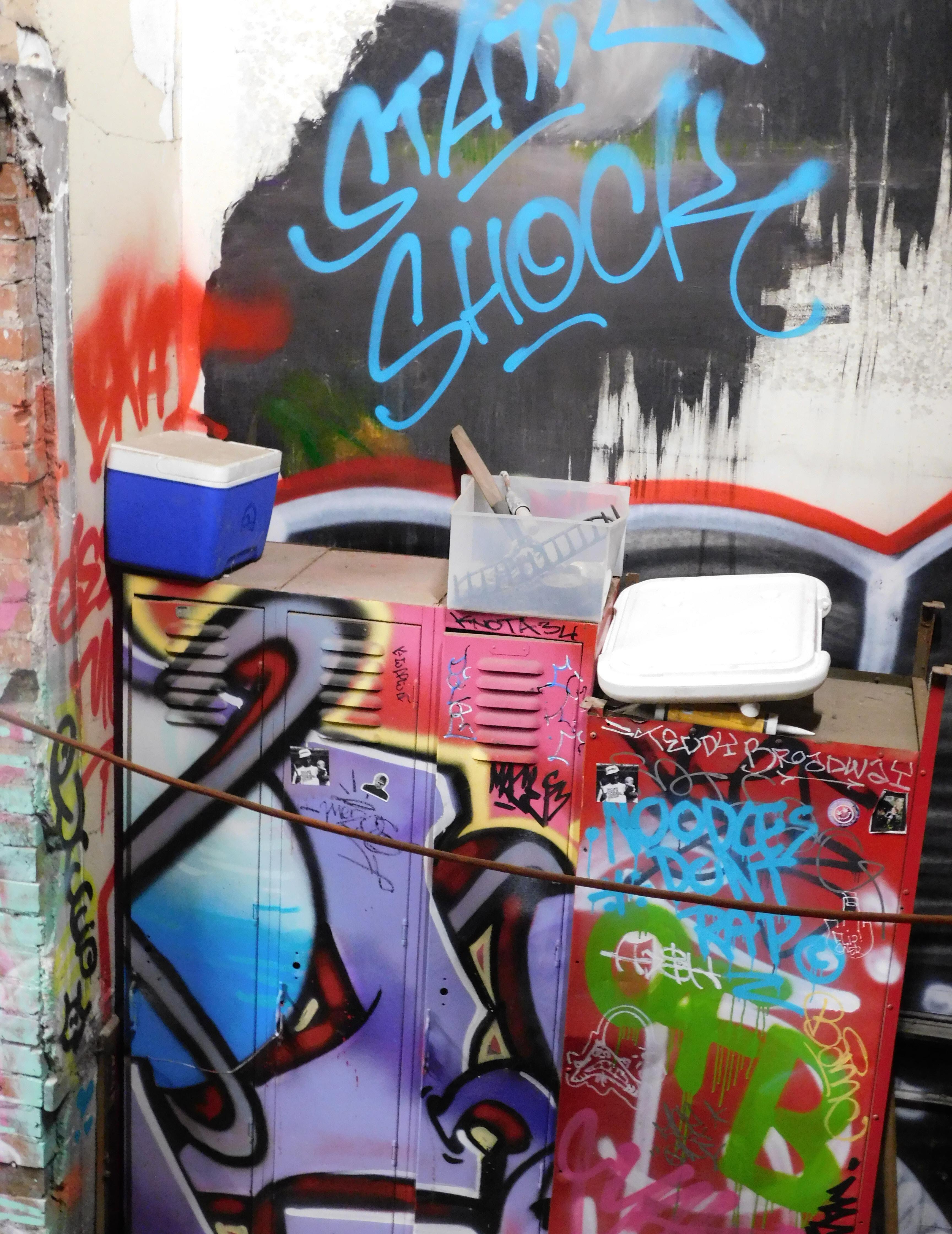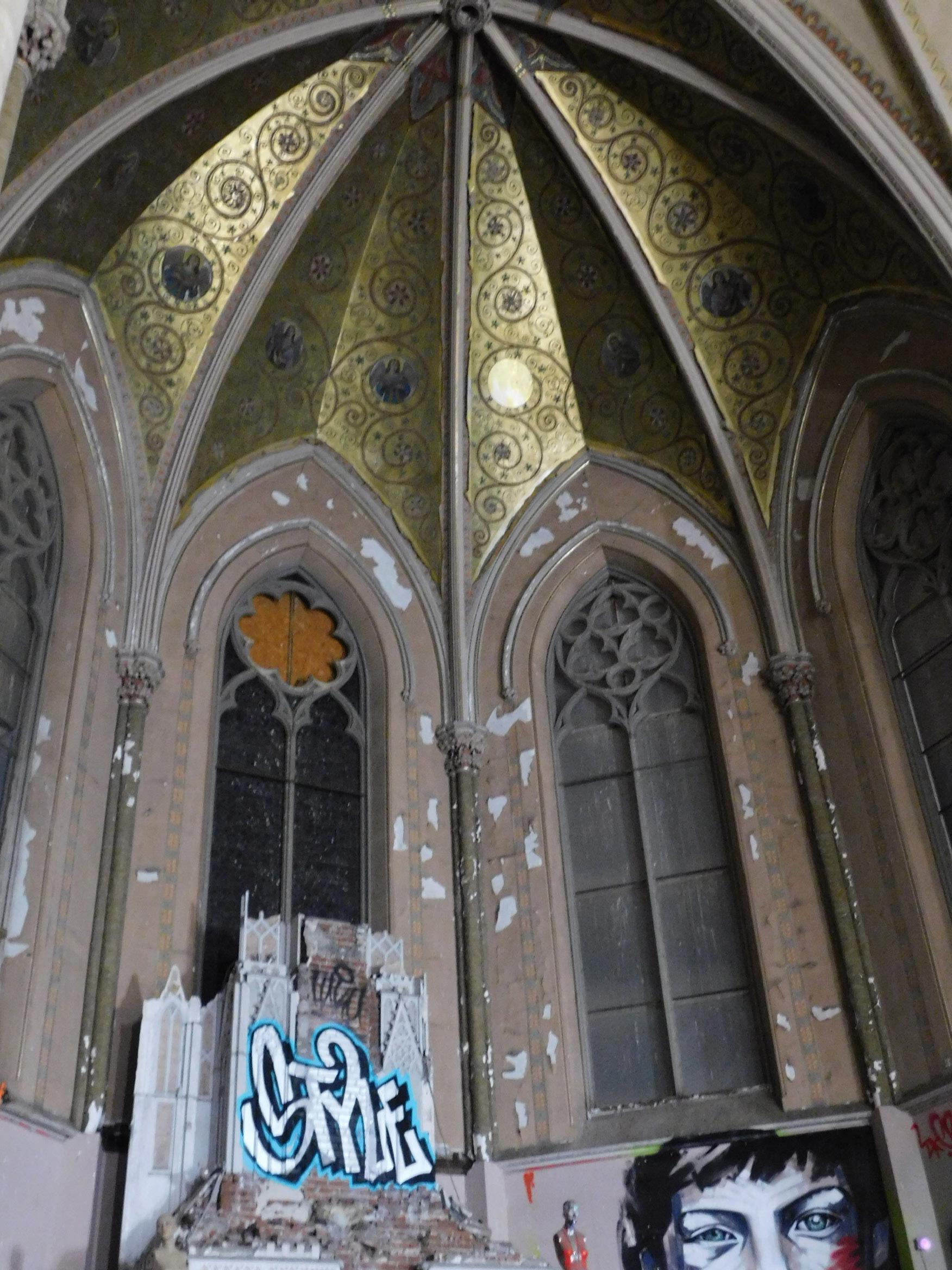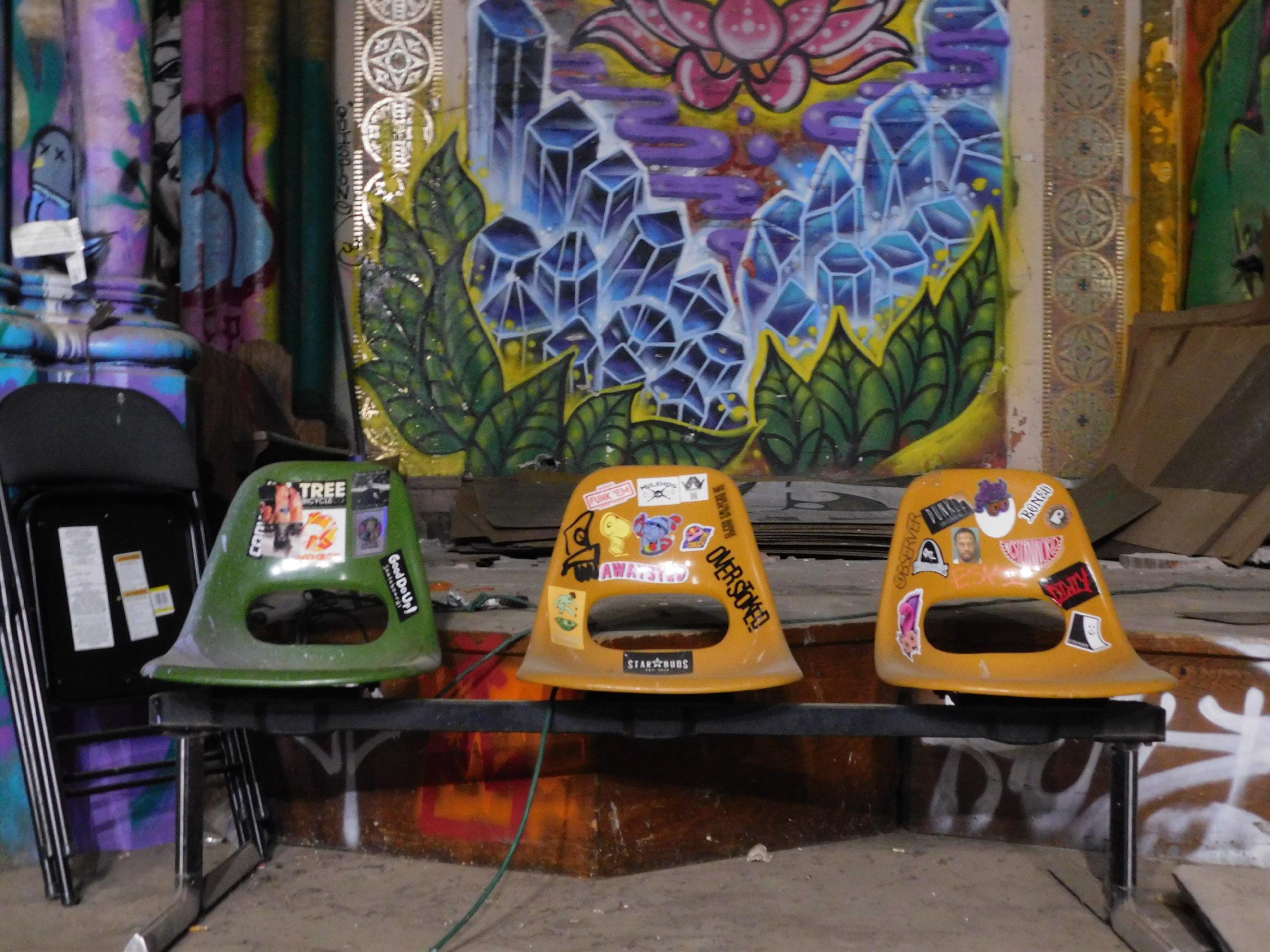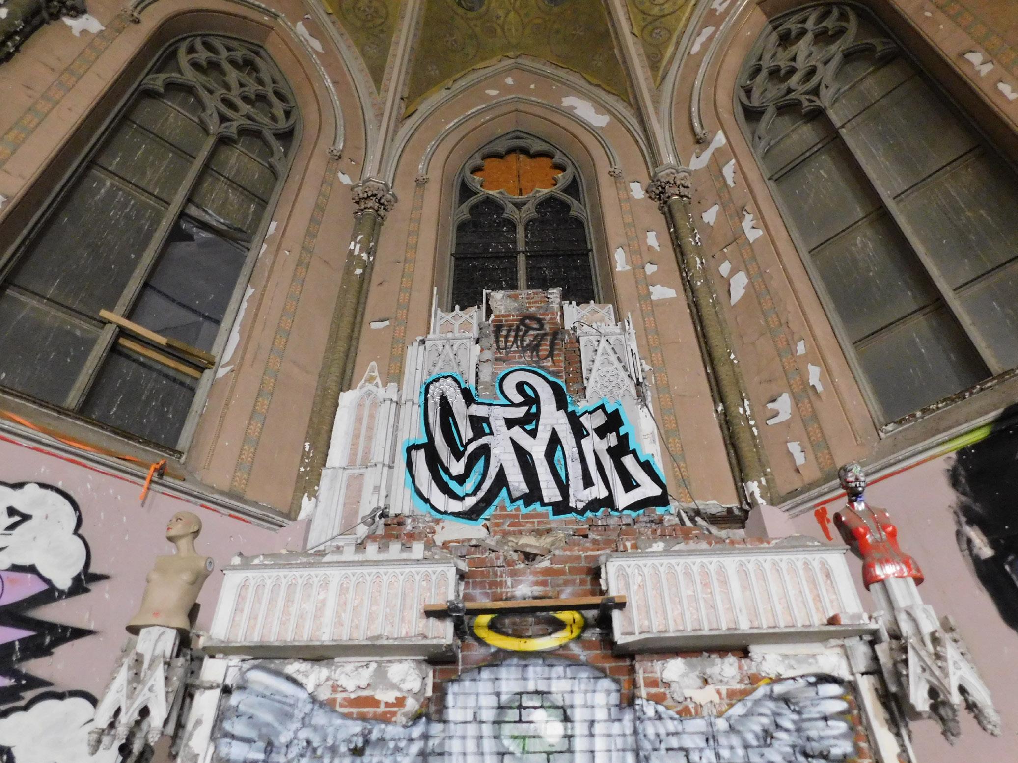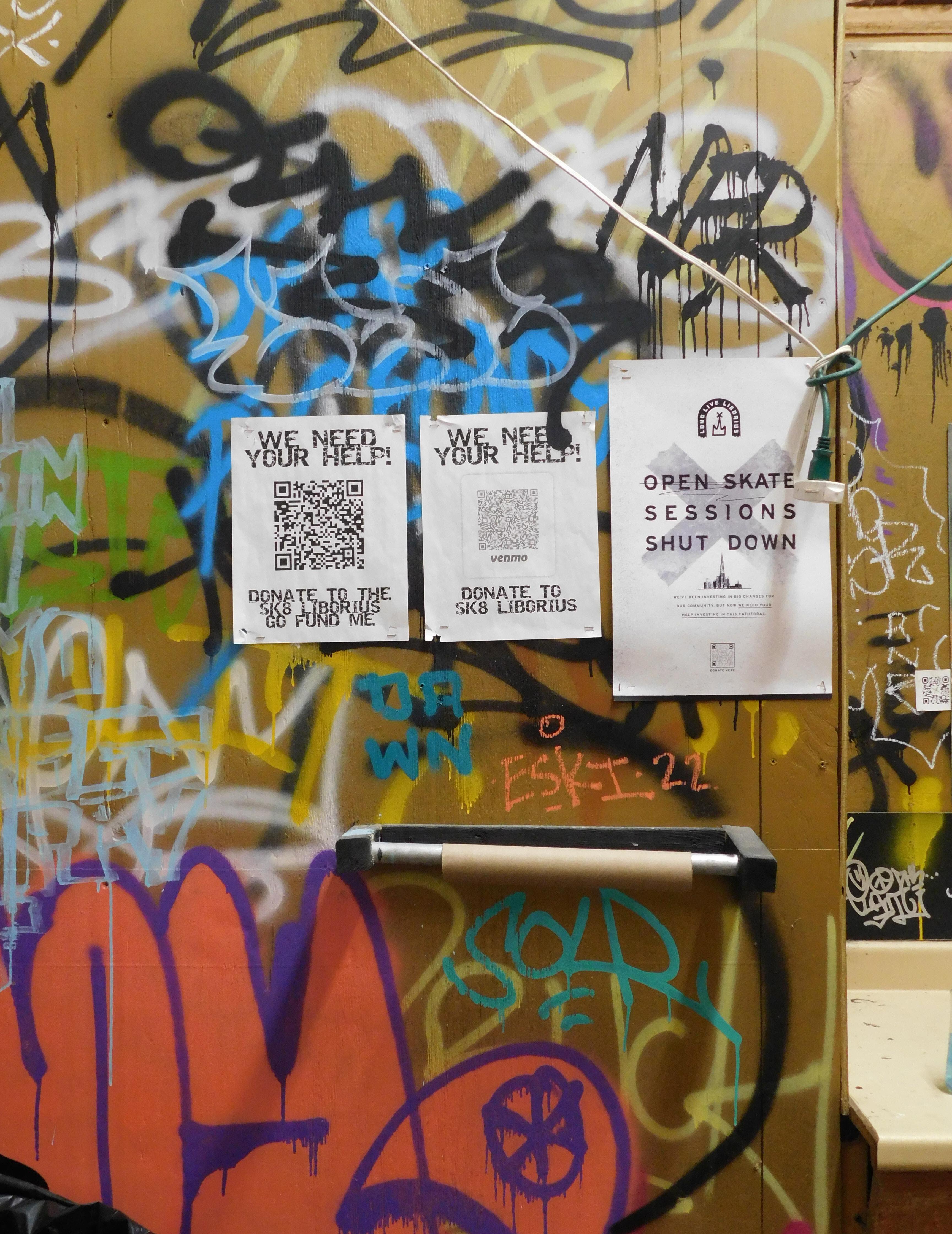Iwas greeted at the Sk8 Liborius Church by founder Dave Blum, and his two-year-old daughter who rode on his shoulders. It is hard to not be awe struck by the beauty of it all: the towering spire piercing the night sky, the massive doors that open up to a world of reinvention, the sprawling colors of graffiti art.