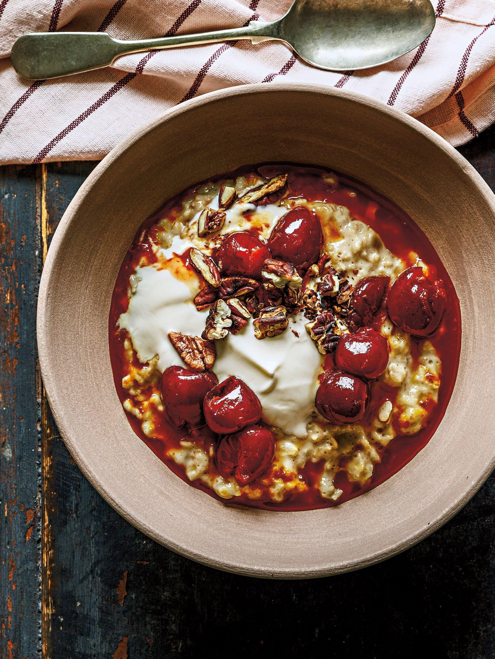 En revansch för havregrynsgröten. Krämig och toppad med tjock yoghurt, körsbär som värms med apelsin samt knapriga pekannötter. Väldigt enkelt och långt ifrån den tråkiga grå havregrynsgröten på dagis.