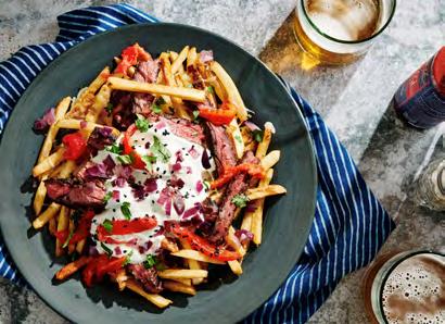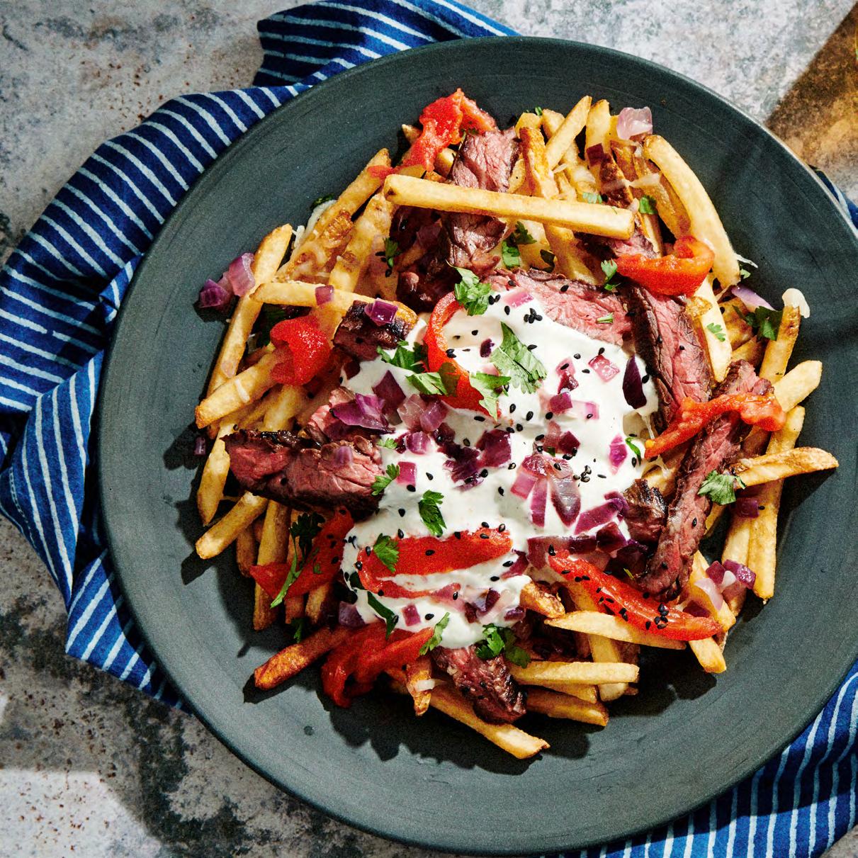 For this shareable app, marinate Braveheart Skirt Steak in a mixture of soy sauce, sugar, and white wine vinegar. Carve the steak into thin strips and place it on a bed of golden, easy-prep Bountiful Harvest French Fries. Then infuse the sour cream topping with caramelized onions and toss in some melty Bacio Mozzarella Cheese.