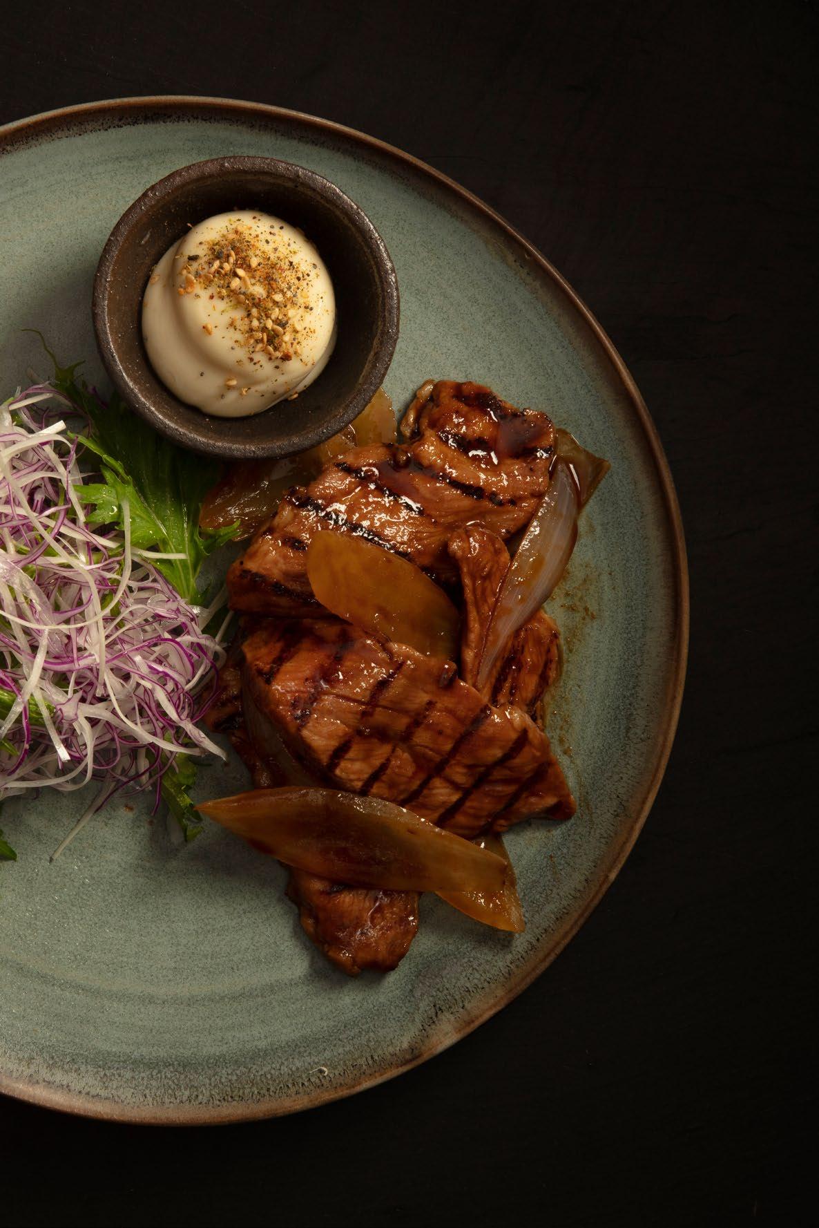 Filete de salmón marinado con miso dulce. Acompañado de ensalada de repollo, lechuga mizuna, cebolla y salsa ponzu con aceite de oliva.