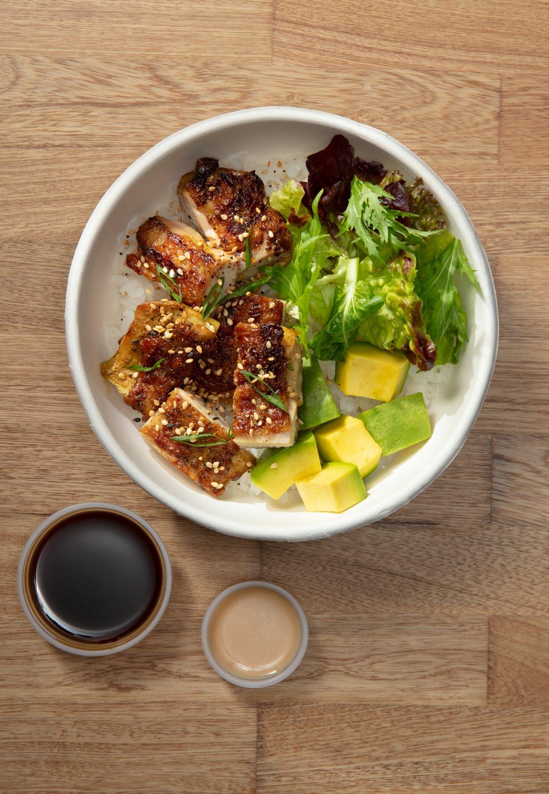 Contramuslo a la parrilla marinado con soya, ajo y jengibre, arroz de sushi o integral, aguacate, ajonjolí, mix de lechugas, cebollín oriental y shichimi. Con salsa teriyaki y mandarina. $26.900