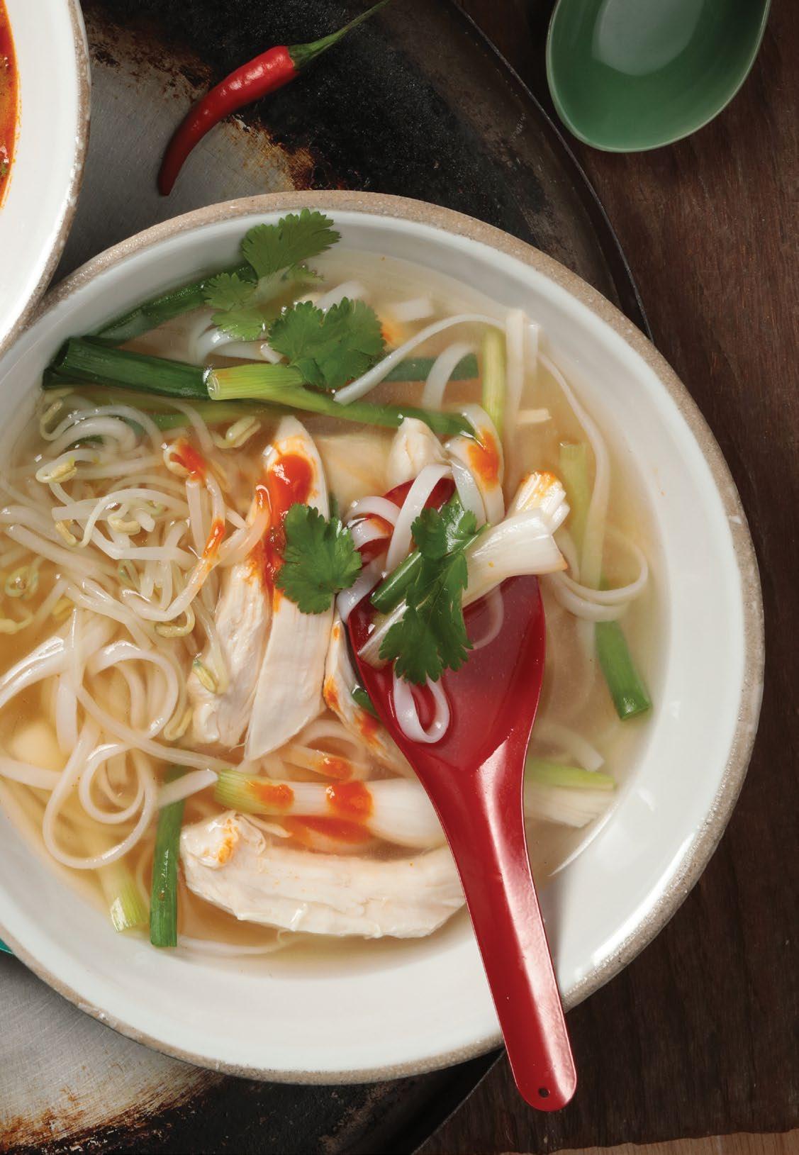 Consomé de pollo, con pasta de arroz, salsa de ostras, cebollín oriental y cilantro. Servida con salsa sriracha y limón. $34.900
