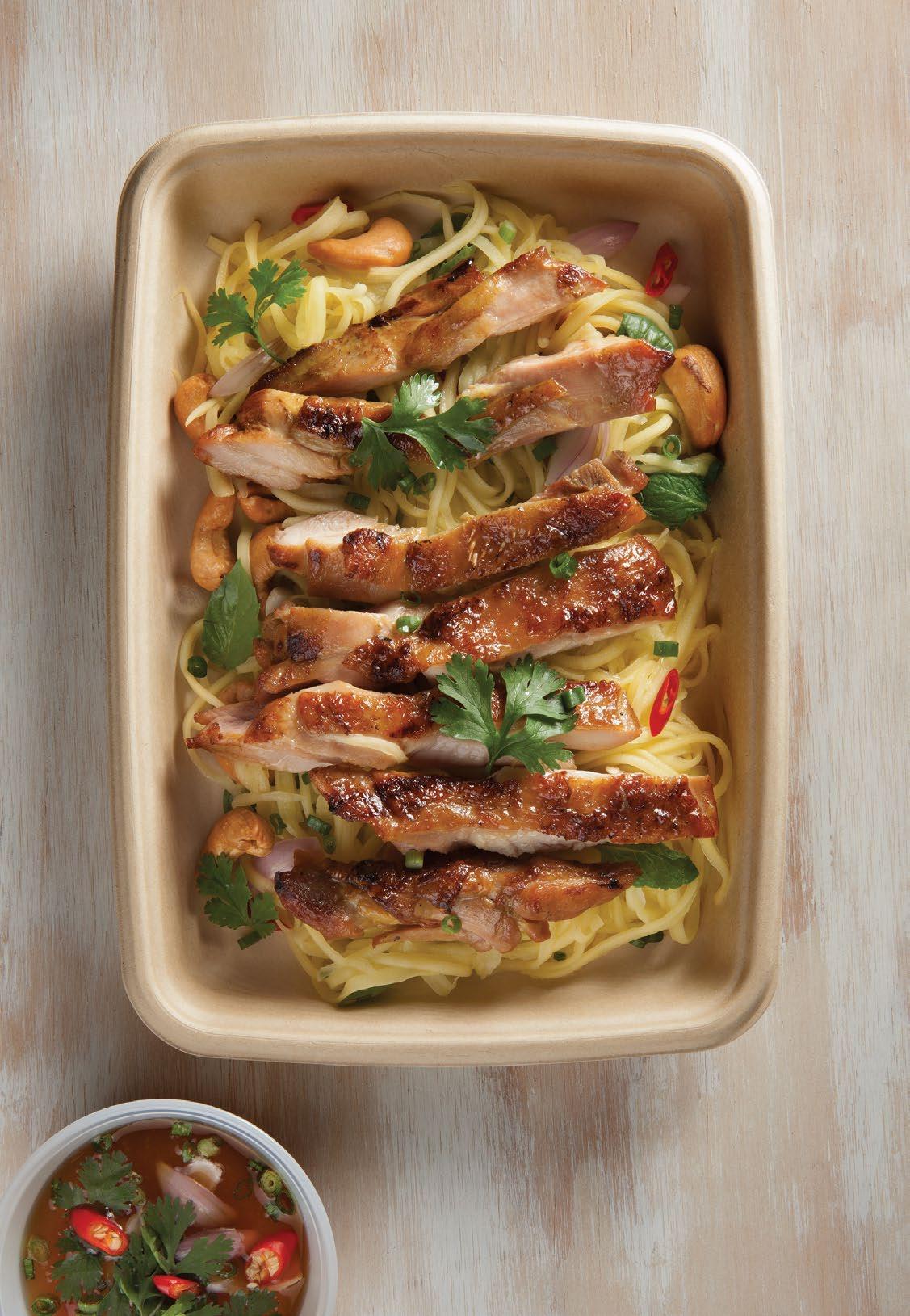 Pernil de pollo a la parrilla con pasta (a base de harina y huevo), vegetales y chips de ajo, en curry amarillo con leche de coco, aceite de maní, pasta de camarones, albahaca siam, limón kaffir y nam-pla. $49.700