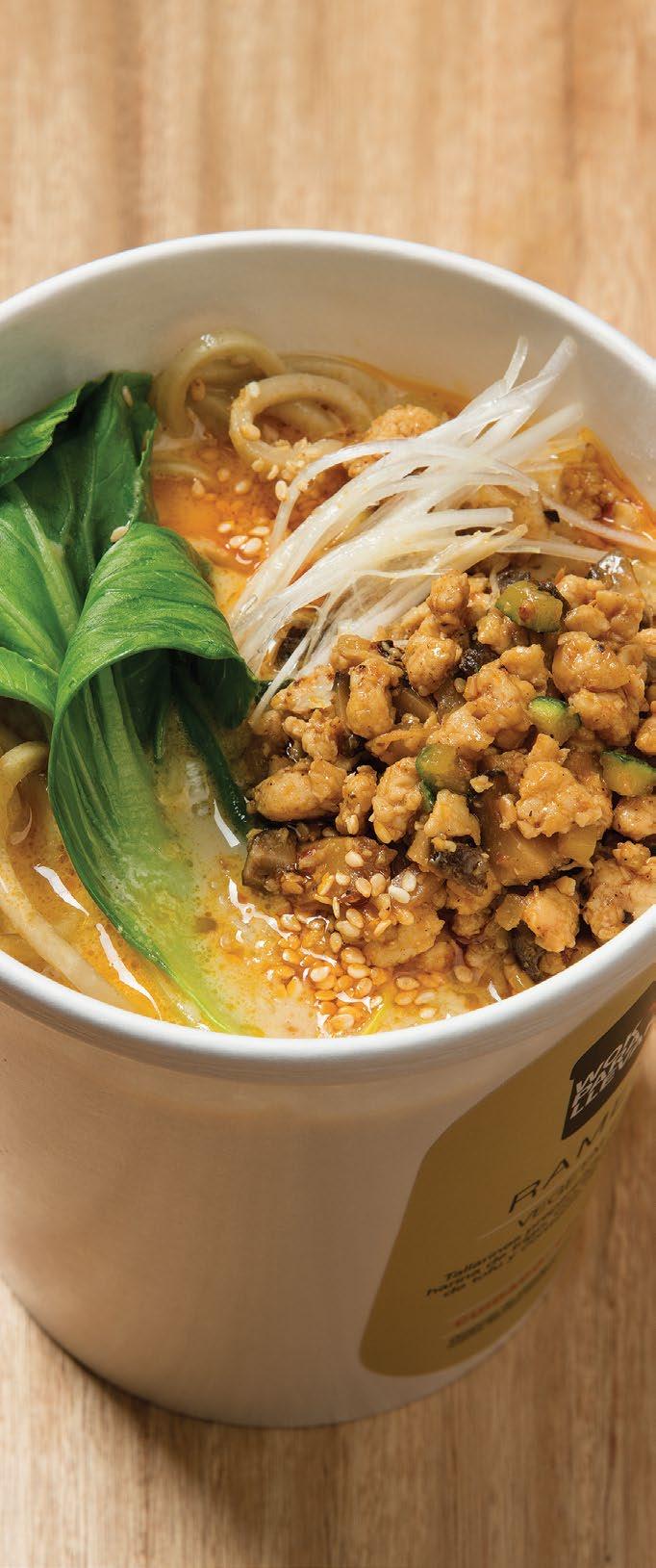 Tallarines preparados sin huevo, pechuga de pollo picada salteada con shitake y calabacín, consomé de pollo con tahini, pimienta szechuan, ajonjolí, aceite de chile, ajo, cebolla, bok choy y salsa chashu (a base de soya y cerdo)