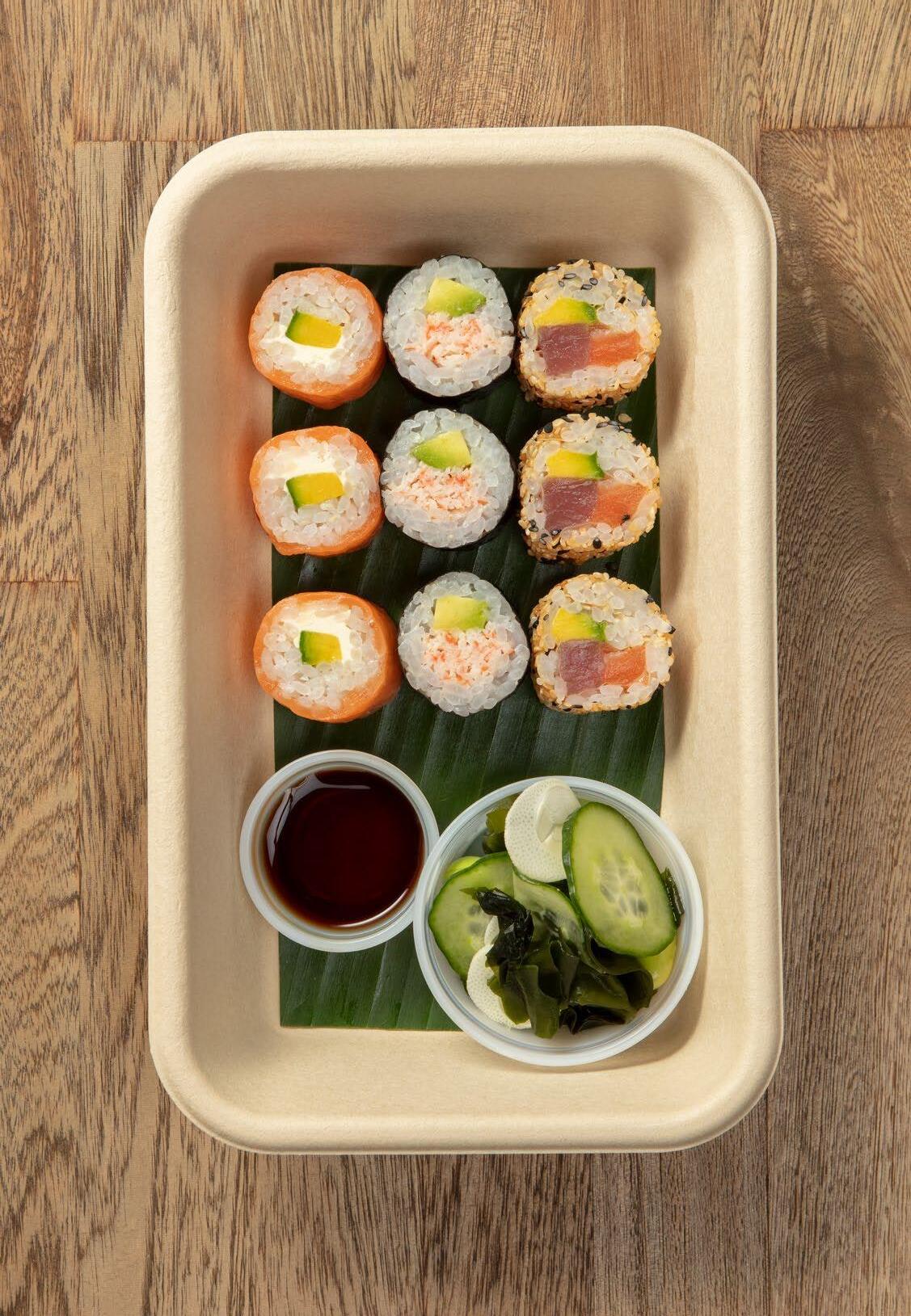 California clásico (9u) Camarón, palmito de cangrejo y mayonesa, aguacate, pepino y ajonjolí. $33.600