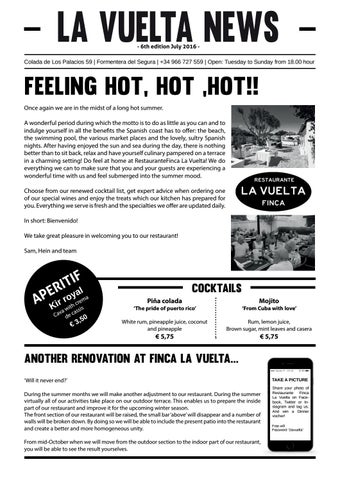 Feeling hot, hot ,hot!! Once again we are in the midst of a long hot summer. A wonderful period during which the motto is to do as little as you can and to indulge yourself in all the benefits the Spanish coast has to offer: the beach, the swimming pool, the various market places and the lovely, sultry Spanish nights. After having enjoyed the sun and sea during the day, there is nothing better than to sit back, relax and have yourself culinary pampered on a terrace in a charming setting! Do feel at home at RestauranteFinca La Vuelta! We do everything we can to make sure that you and your guests are experiencing a wonderful time with us and feel submerged into the summer mood. Choose from our renewed cocktail list, get expert advice when ordering one of our special wines and enjoy the treats which our kitchen has prepared for you. Everything we serve is fresh and the specialties we offer are updated daily. In short: Bienvenido! We take great pleasure in welcoming you to our restaurant! Sam, Hein and team