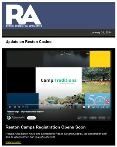 Open rates on all digital publications remains extremely high compared to industry standard, with all publications averaging open rates of more than 50%. Subscriptions remained steady year-over-year with only minor fluctuations. Additionally, the Reston Today promotional video series remains strong, and it has also now been supplemented with shorter “Reston Minute” segments and other video promotions to better share the story of RA. Print publications also remain strong; the quarterly Activities Guide is sent to more than 21,000 households and is routinely listed as one of the top vessels members use to receive information on RA programs and events.
