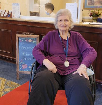 At left, Rodolfo O’Shea receives a warm greeting from Director of Activities Adina Cimpean. Below, Jean Hardison smiles on the red carpet on move-in day.