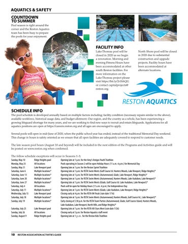 SCHEDULE INFO The pool schedule is developed annually based on multiple factors including; facility condition (necessary repairs similar to the above), available workforce, historical usage data, and budget allotment. Our region, and the country as a whole, has been experiencing a growing lifeguard shortage for many years, and we are working to find new ways to recruit and retain lifeguards. Applications for all aquatics positions are open at https://careers.reston.org and all ages are encouraged to apply. Several pools will open in mid-June of 2020, when the public school year has ended, instead of the traditional Memorial Day weekend. This change in hours is safety oriented as we ensure that all open facilities are adequately covered to respond to customer needs. The late season pool hours (August 10 and beyond) will be included in the next edition of the Programs and Activities guide and will be posted on www.reston.org when confirmed. The follow schedule exceptions will occur in Seasons 1-3; Sunday, May 10 Ridge Heights pool Opening late at 1 p.m. for the Amy’s Amigos Youth Triathlon Monday, May 25 All locations Pools operating in Season 2 will be open Holiday Hours (11 a.m.-6 p.m.) for Memorial Day Sunday, May 31 Lake Newport pool Opening late at 1 p.m. for the Reston Sprint Triathlon Saturday, June 6 Multiple locations* Opening late at 1 p.m. for RSTA Swim Meets (Golf Course Isl. Hunters Woods, Lake Newport, Ridge Heights)* Saturday, June 13 Multiple locations* Opening late at 1 p.m. for RSTA Swim Meets (Autumnwood, Glade, Lake Newport, Ridge Heights)* Saturday, June 20 Multiple locations* Opening late at 1 p.m. for RSTA Swim Meets (Autumnwood, Hunters Woods, Lake Audubon, Lake Newport)* Saturday, June 27 Multiple locations* Opening late at 1 p.m. for RSTA Swim Meets (Glade, Golf Course Isl. Lake Audubon, Lake Newport)* Saturday, July 4 All locations Pools will be open for Holiday Hours (11 a.m.-6 p.m.) for Independence Day Saturday, July 11 Multiple locations* Opening late at 1 p.m. for RSTA Swim Meets (Glade, Lake Audubon, Lake Newport, Ridge Heights)* Wednesday, July 15 Lake Newport pool Closing early at 4 p.m. for the RSTA IM Finals (rain date 7/16) Saturday, July 18 Multiple locations* Opening late at 1 p.m. for RSTA Swim Meets (Autumnwood, Hunters Woods, Golf Course Isl., Lake Newport)* Sunday, July 19 Multiple locations* Early closing at 5:30 p.m. for the RSTA Team Parties (Autumnwood, Glade, Golf Course Island, Hunters Woods, Lake Audubon, Lake Newport, North Hills, and Ridge Heights)* Saturday, July 25 Lake Newport pool Opening late at 1 p.m. for the RSTA All-Stars Meet (rain date 7/26) Sunday, July 26 All locations Closing early at 5 p.m. for Reston Aquatics staff event Sunday, August 9 Ridge Heights pool Opening late at 1 p.m. for the Reston Kids Triathlon