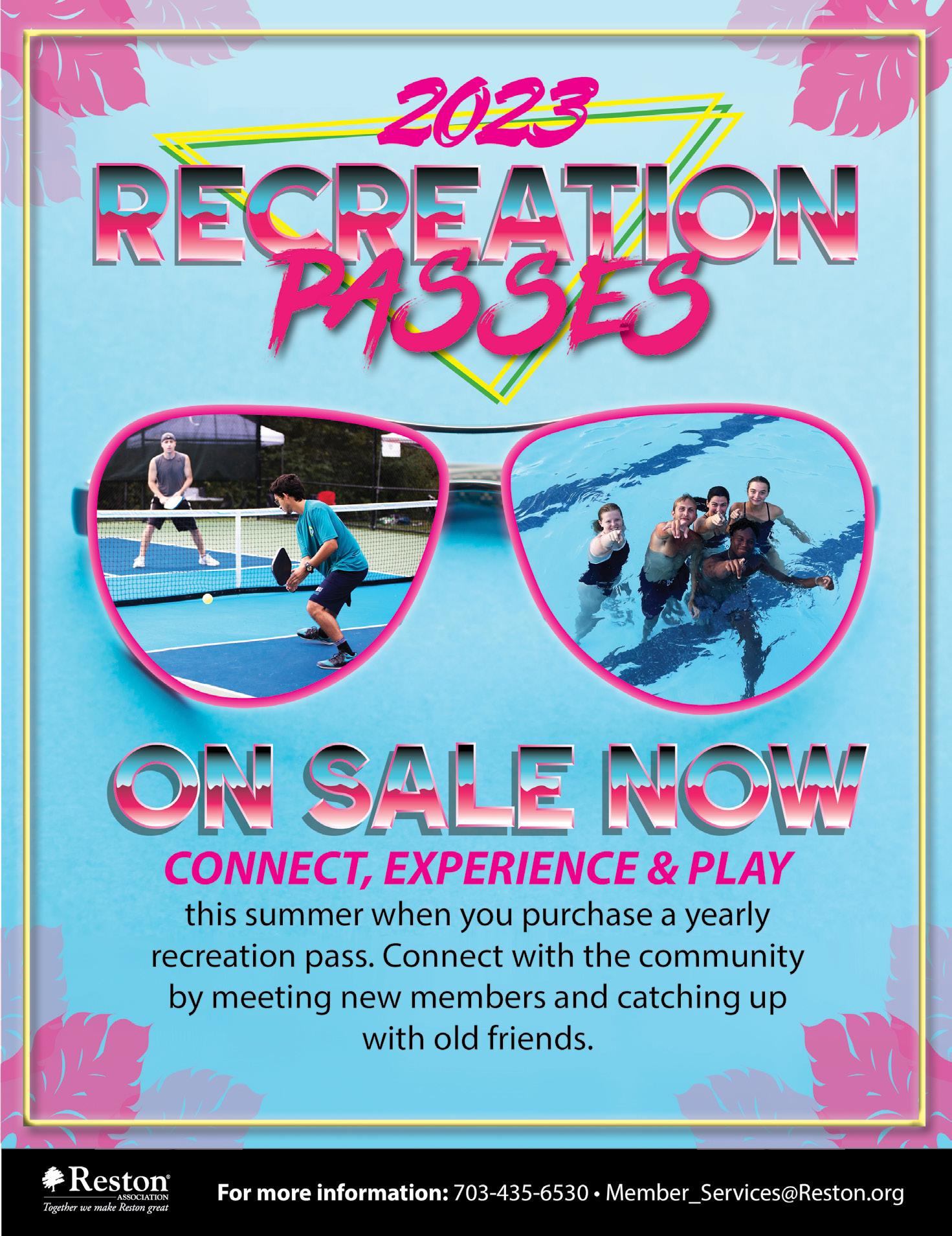 Connect, Experience & Play this summer when you purchase a yearly recreation pass. Connect with the community by meeting new members and catching up with old friends. Experience our tennis courts and the various features they offer — 8 and under 36-foot yearround hard surface, clay surface, lighted facilities, hitting walls and 4 drop-in pickleball courts. Visit our pools which include something for everyone — lap lanes, heated pools, hot tubs, diving boards, spray parks, shaded picnic areas and water slides. Community fountain features add to the fun. We hope this pass will allow you to Play this summer and experience all that Reston has to offer.