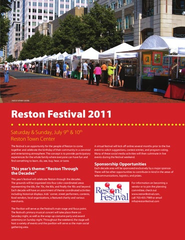 Reston Festival 2011 Saturday & Sunday, July 9th & 10th Reston Town Center The festival is an opportunity for the people of Reston to come together and celebrate the birthday of their community in a convivial and entertaining atmosphere. The concept is to provide participatory experiences for the whole family where everyone can have fun and find something to learn, do, see, buy, hear, or taste.