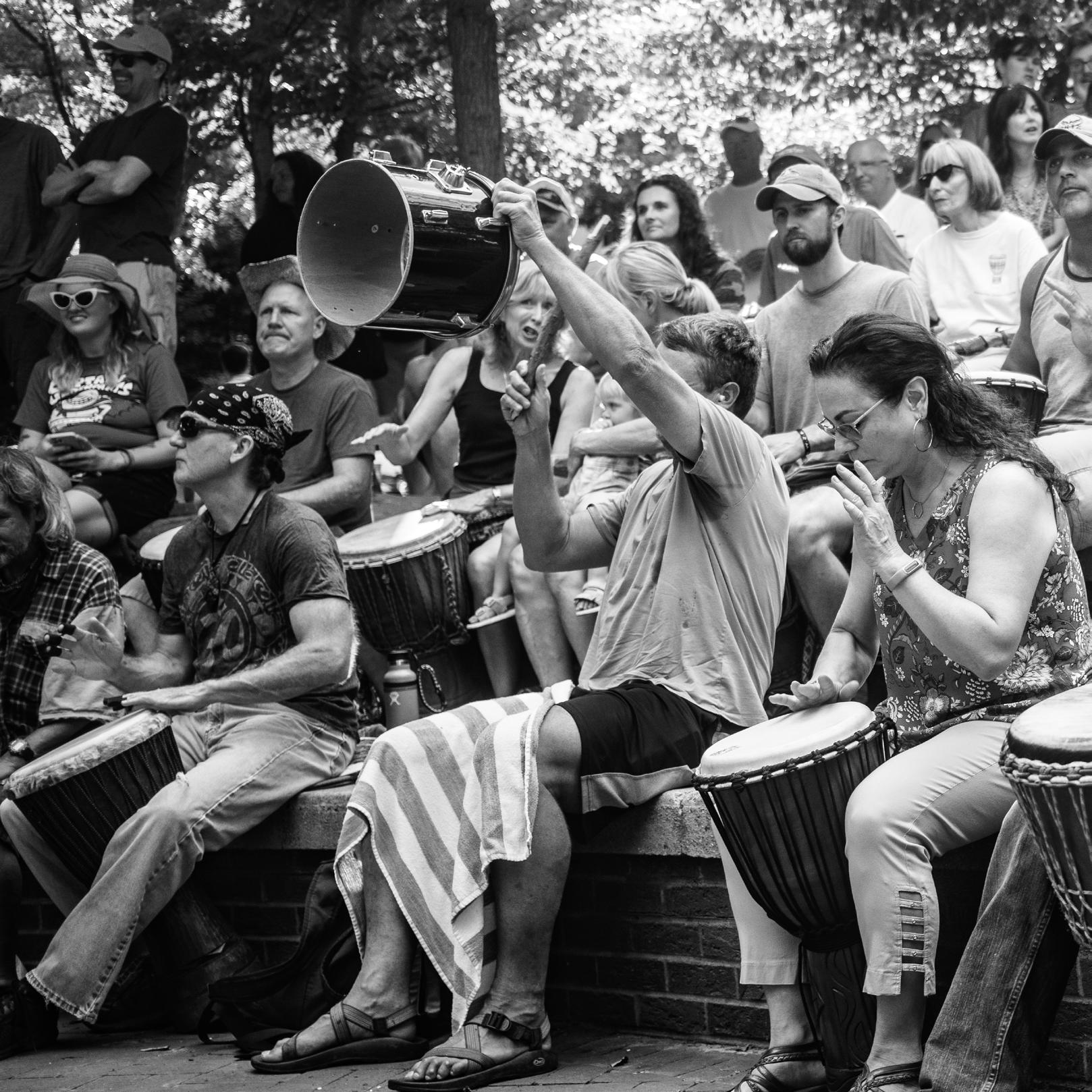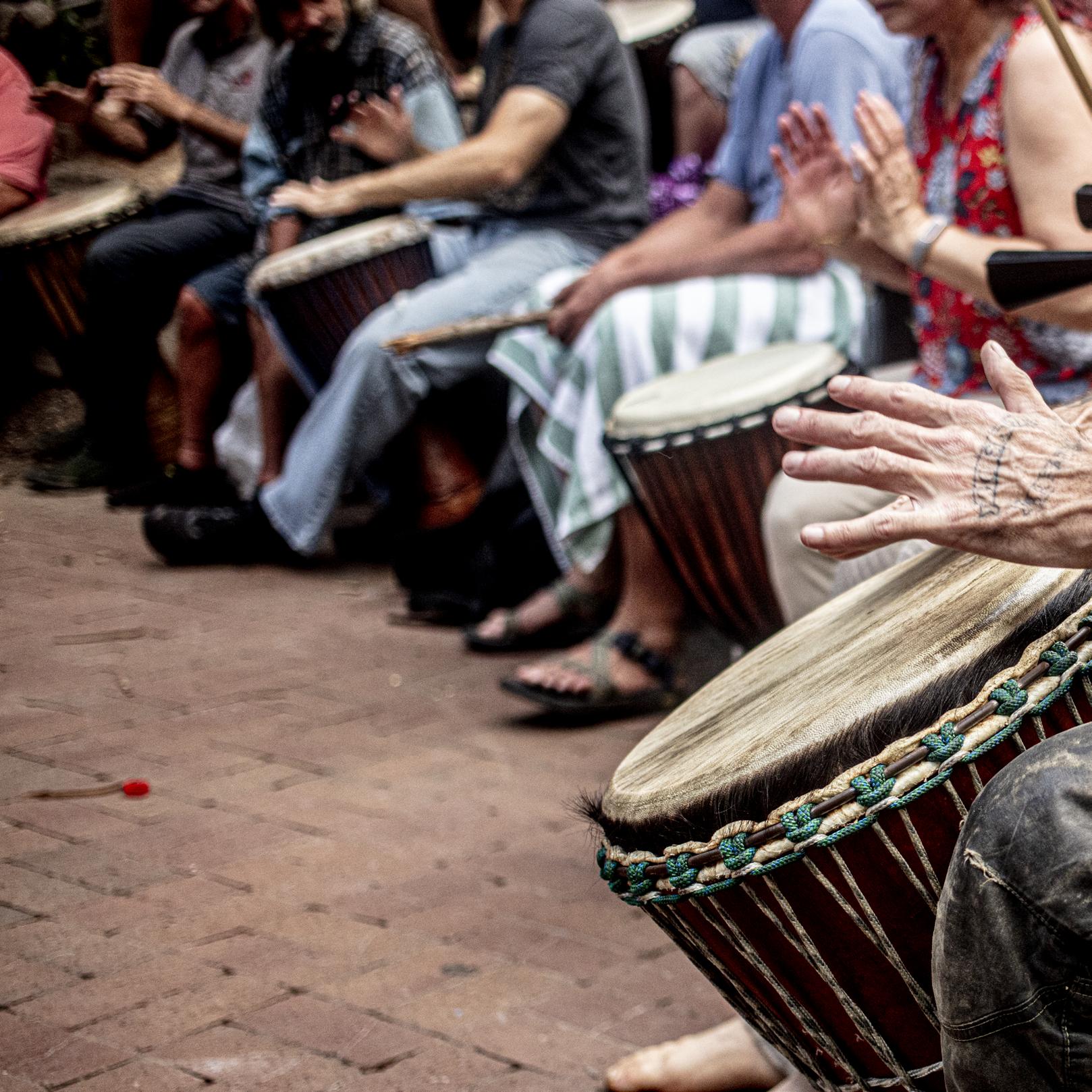 Every Friday evening at Pritchard Park, directly across the street from the Restoration Asheville, a peaceful group of drummers can be found finding rhythm. All are welcome and anyone can join in.