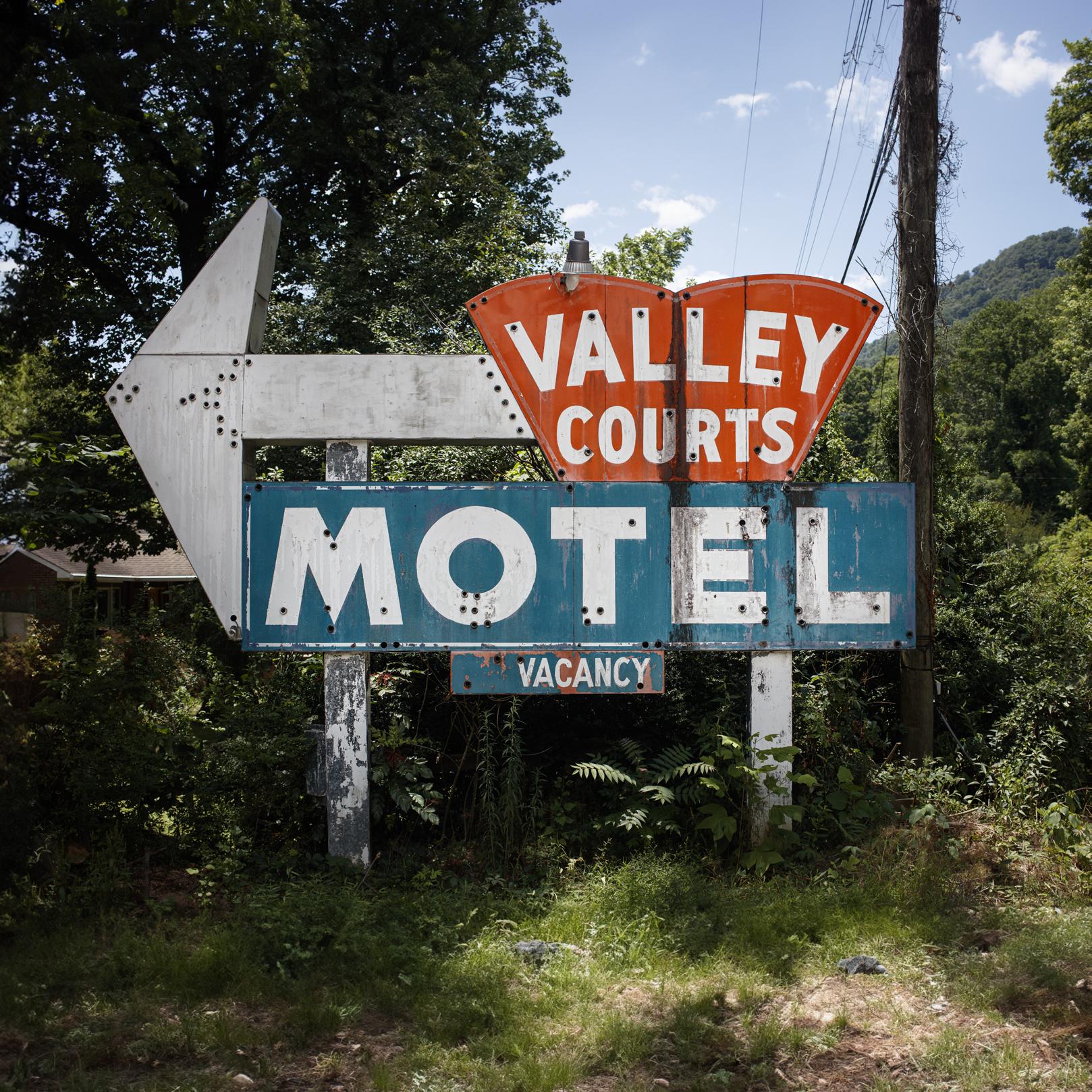 The Valley Courts Hotel, now decaying and forgotten, opened in 1964 in Tryon North Carolina. It was nearly impossible to drive up to the old structure as nature was taking back over. This old sign is down by the road on US 176.