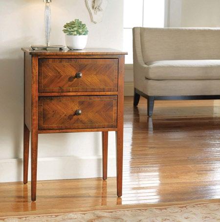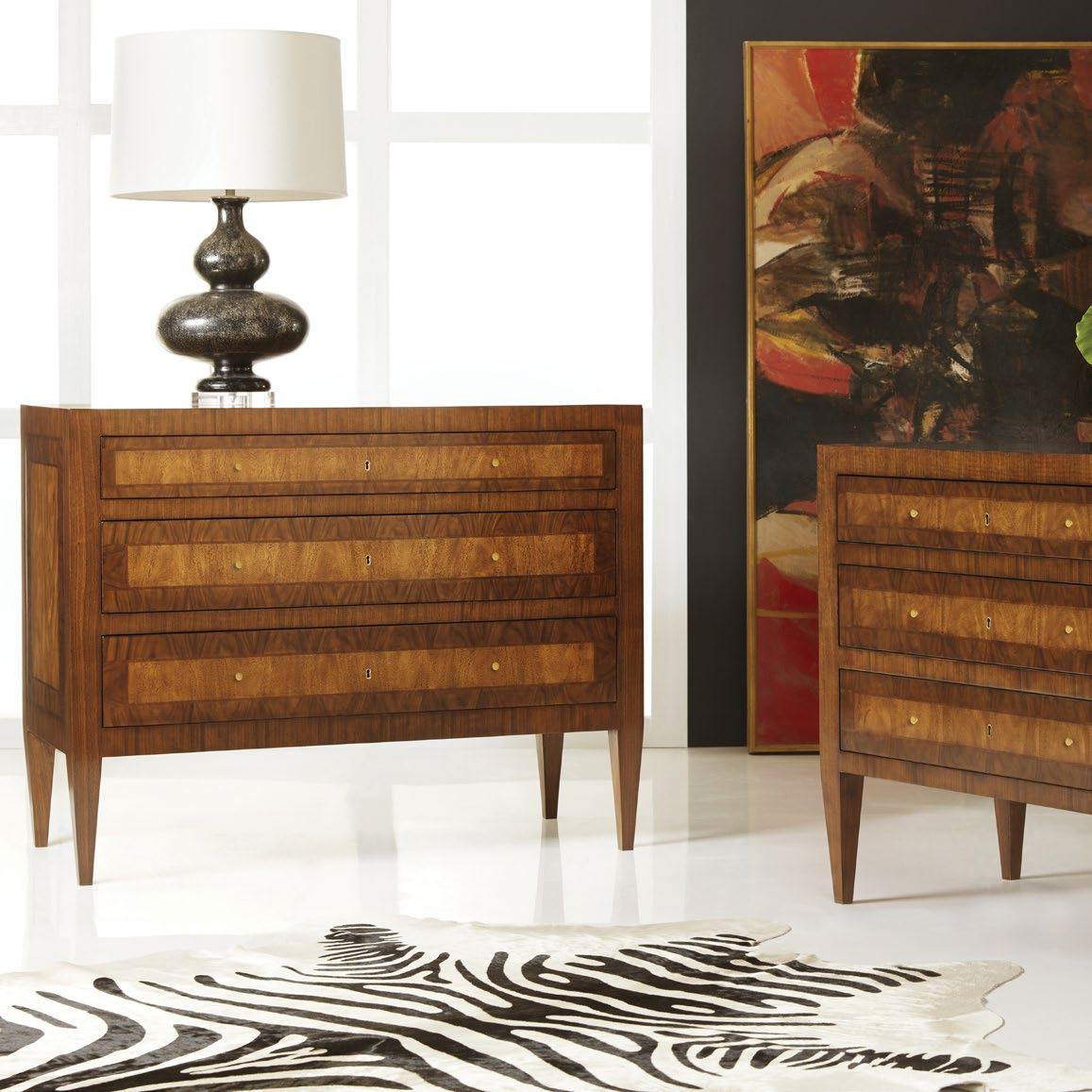 This handsome bedside chest offers an attractive place to stash your treasures away, featuring the contrasting beauty of walnut, mahogany and kingwood veneers accented by functional brass locks.