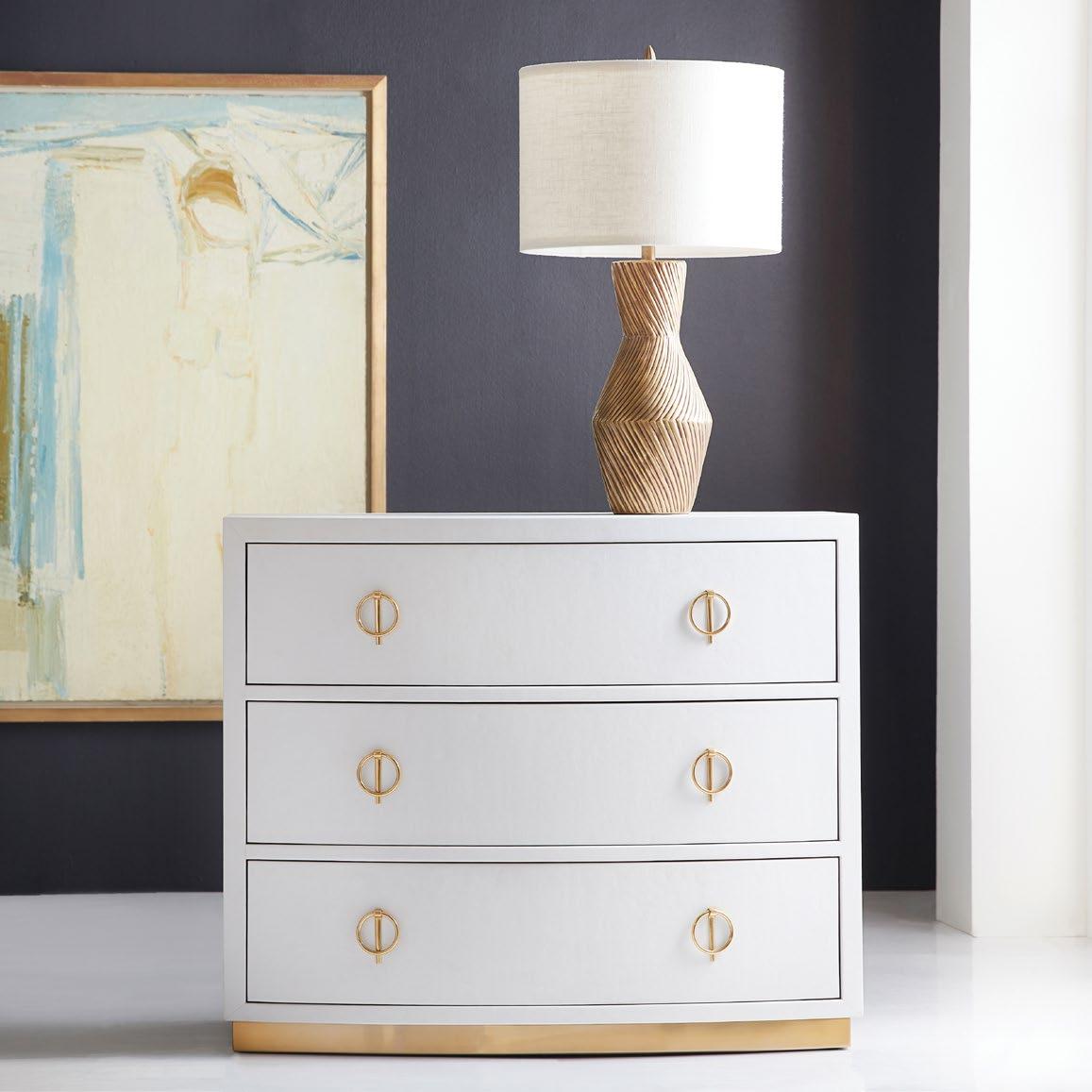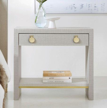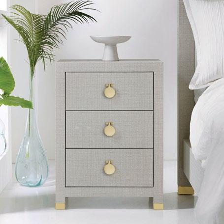 This petite nightstand adds a light and airy accent to the bedroom, featuring an exterior that resembles woven fabric and contemporary polished brass hardware for just a touch of shine.