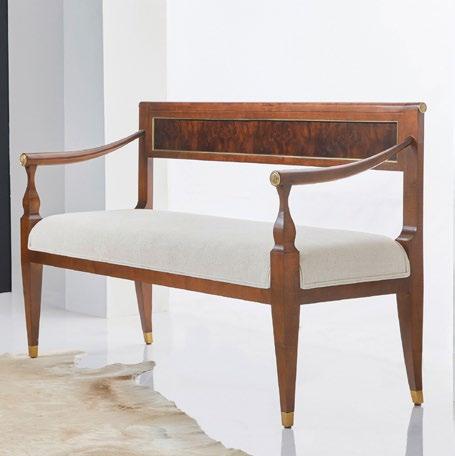 Combining gorgeous walnut burl veneer with antique brass accents and tailored upholstery, this bench creates a lovely spot to rest in any space.