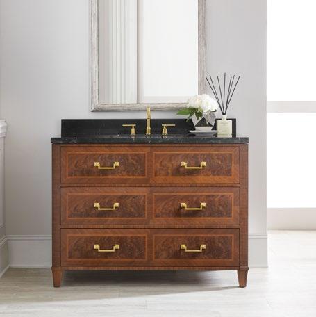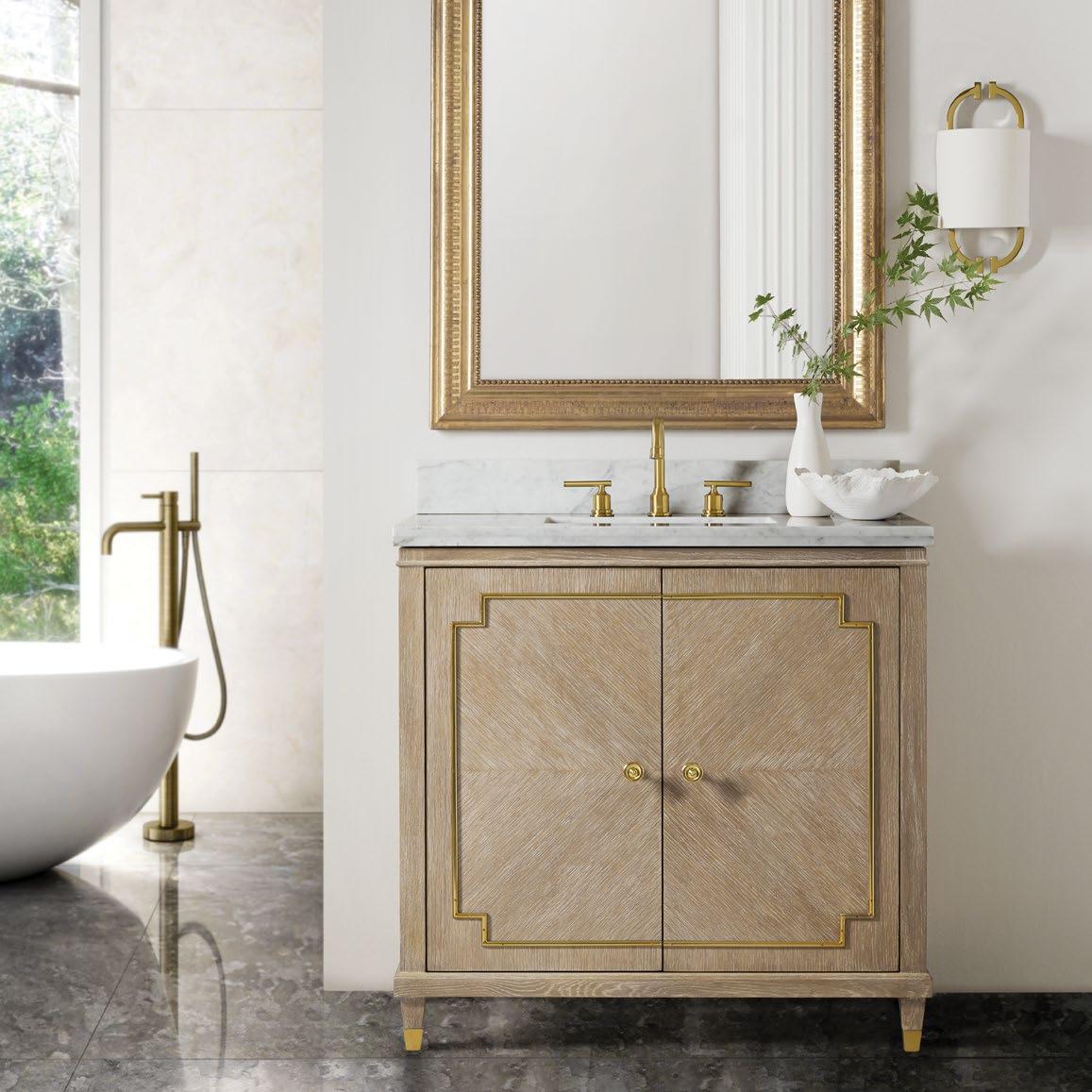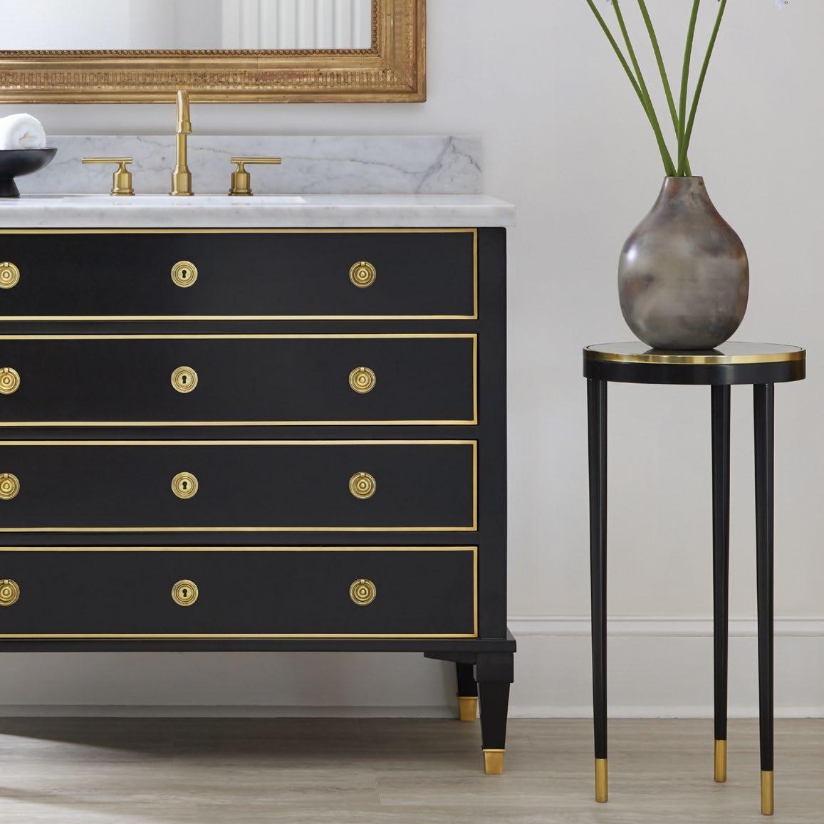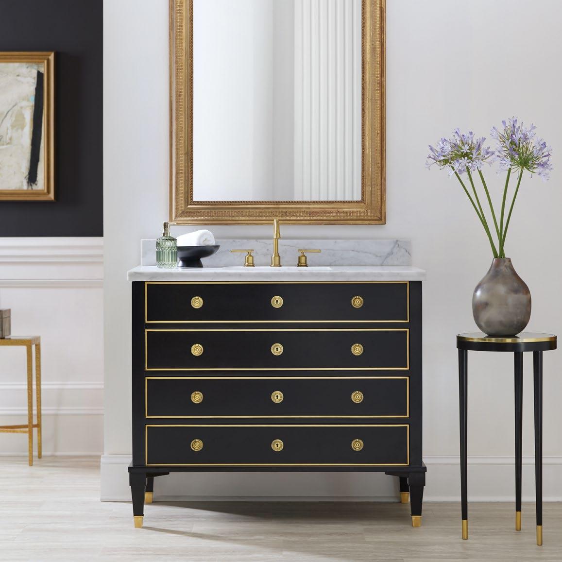 This collection of vanities is based on some of our most classic styles, especially crafted to be the highlight of any bath or powder room. These versatile pieces combine sleek modern finishes such as ebonized wood, acacia and marble with luxurious accents like gold leaf and brass. The result is our signature forward-looking aesthetic combined with our commitment to timeless quality craftsmanship.