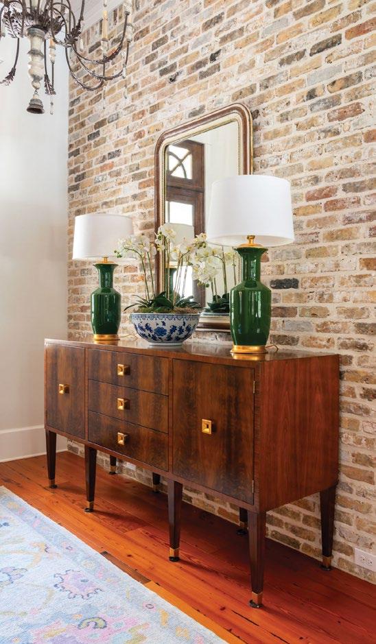 FAIRHOPE, AL THE AVIGNON SIDEBOARD WAS PERFECT FOR THIS FOYER, WHICH NEEDED A LARGE PIECE OF FURNITURE DUE TO THE HIGH CEILINGS. I REALLY WANTED THE SIDEBOARD TO BE ABLE TO HANDLE THE LARGE GREEN LAMPS AND ANTIQUE MIRROR, AND I LOVED THE FEATHERED WALNUT AGAINST THE OLD CHICAGO BRICK WALL.