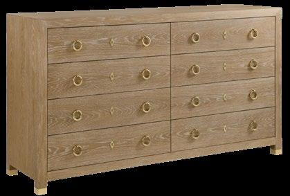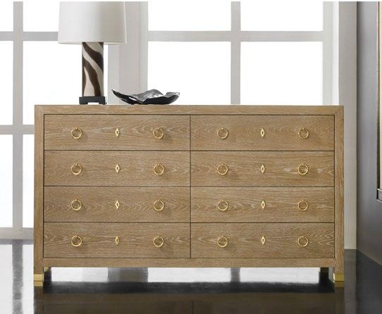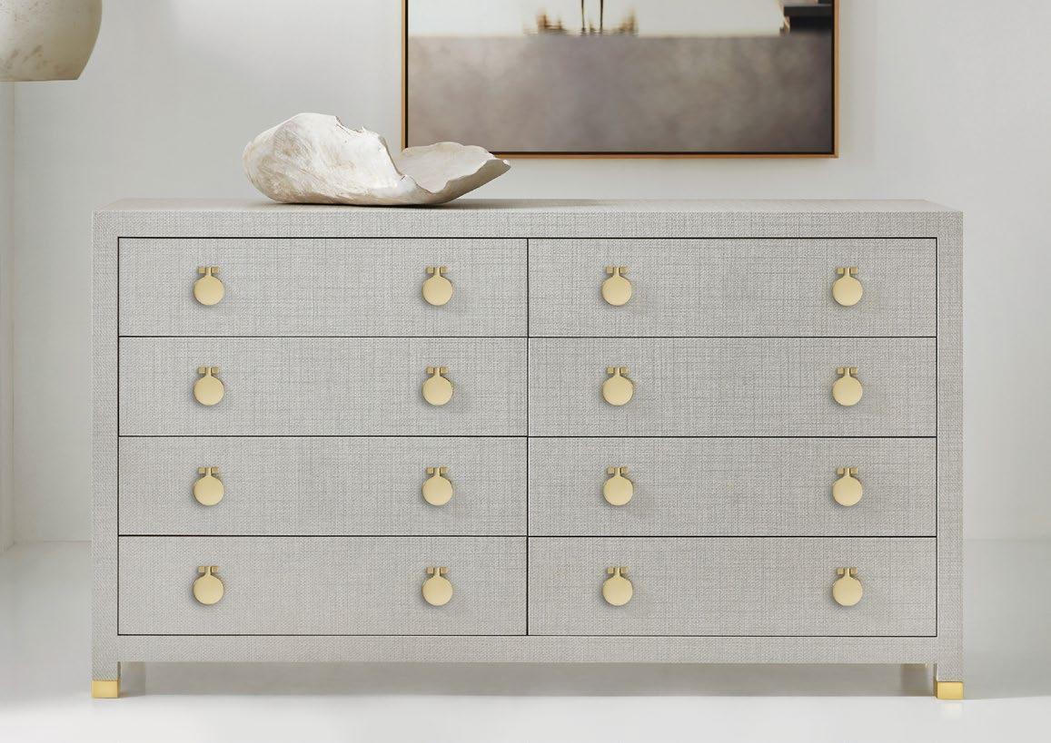 This substantial eight drawer dresser feels light and airy in a vinyl wrap that resembles woven fabric, accented by contemporary polished brass hardware that adds a touch of shine.