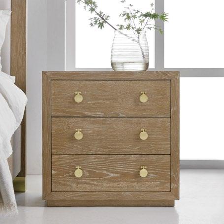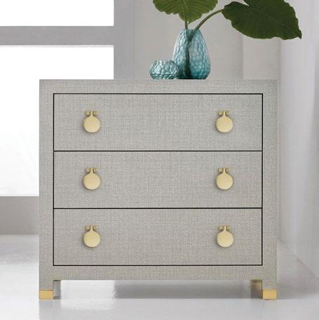 The clean modern lines of this bedside chest look crisp as a tailored suit, with an exterior that resembles woven fabric, accented by circular drawer pulls as chic as a double row of brass buttons.