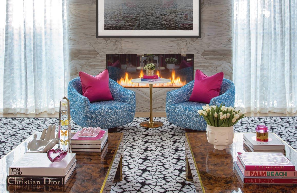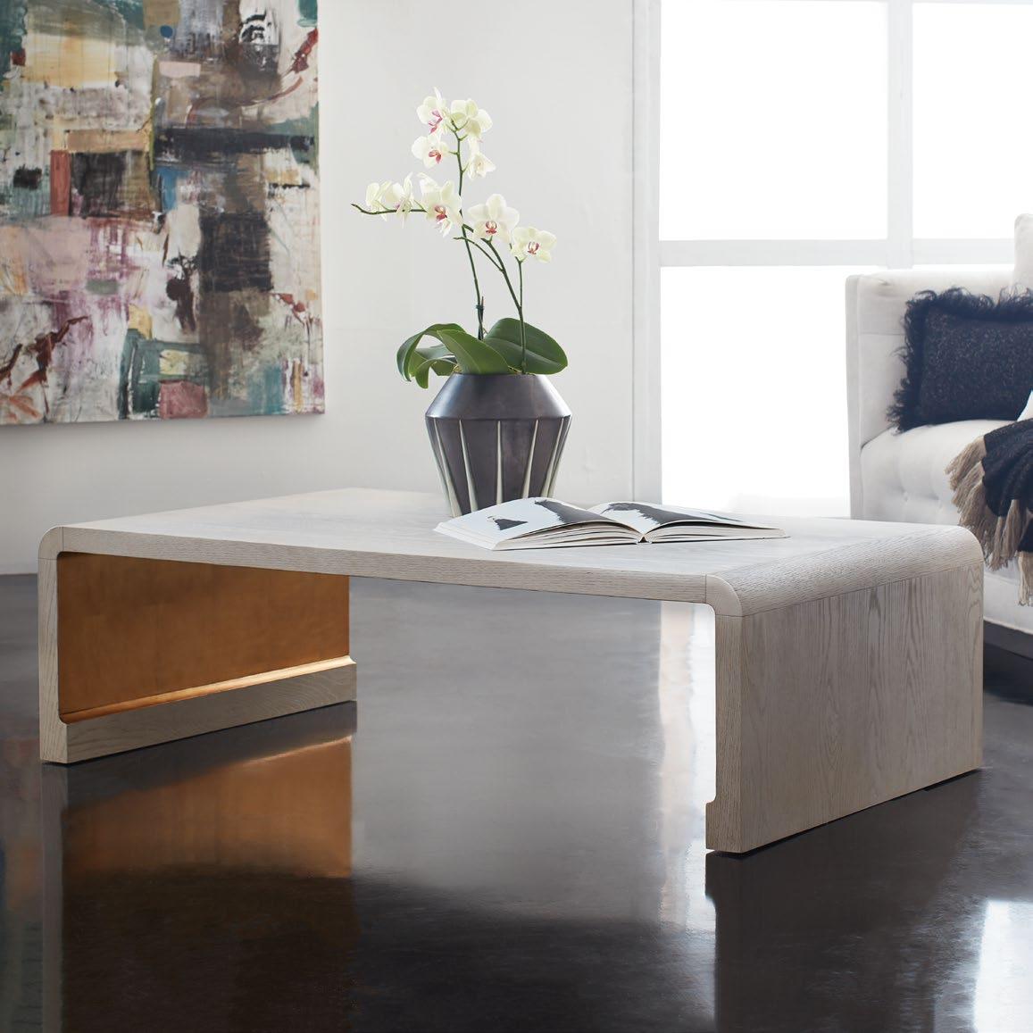 WE SELECTED THE BRICE COCKTAIL TABLE FOR ITS SCALE, TOFFEE PENSHELL AND BRASS DETAILING, WHICH PROVIDED A GROUNDING EFFECT IN A ROOM FULL OF ENERGY, VIBRANT COLOR AND ART. IT’S VERSATILE ENOUGH TO STAND ALONE BUT ALLOWED US TO ANCHOR THE BEST ELEMENTS OF THE INTERIOR IN A SINGULAR PIECE OF FURNITURE.