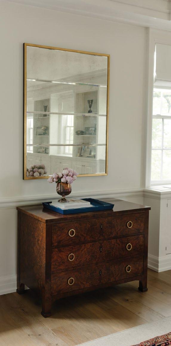 FLANKING THIS OPENING TO BE SYMMETRICAL, ANCHORED BY A PAIR OF ANTIQUE CHESTS. HOWEVER, IT CAN BE VERY CHALLENGING TO FIND A PAIR THAT ARE OLD. THESE LARGE BOWFRONT CHESTS FROM MODERN HISTORY WERE THE PERFECT SOLUTION TO ACHIEVE A WELL-BALANCED AESTHETIC USING HIGH-QUALITY, ENGLISH ANTIQUE REPRODUCTIONS.