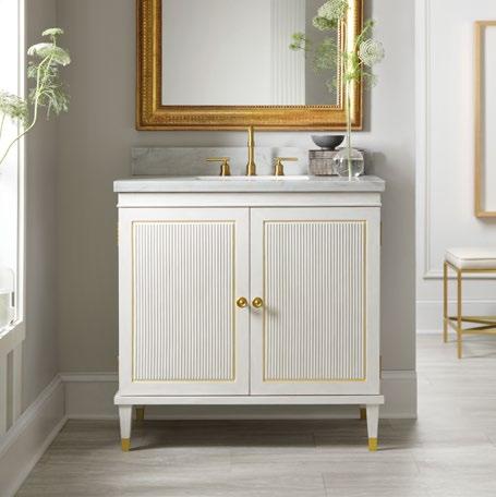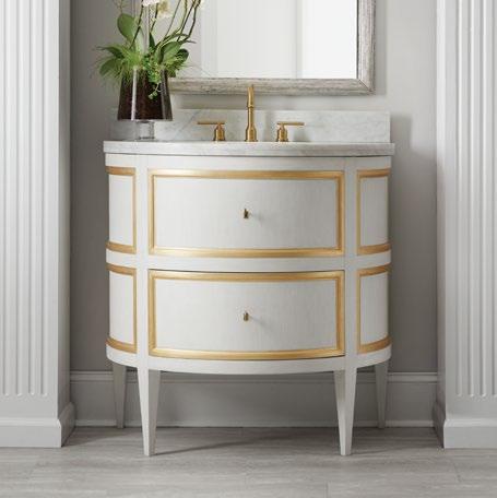 This textured vanity has the style and presence of a cherished heirloom, with an antique white painted finish, delicate gold detailing and classic Carrara marble.