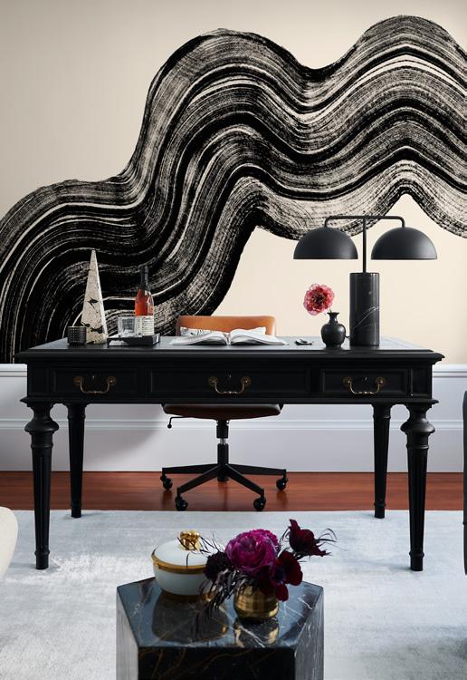 Entertaining was foremost in Rydhima’s mind when creating her My Rowe Design space. “I wanted to create a space that was all about socializing and celebrating,” says the designer, aligning with “my inner desire to design a speakeasy or a cocktail bar.” With gatherings in mind, Rydhima focused on a moody palette, heavy on texture and pattern for a luxurious, elevated aesthetic. Beautiful conversation pieces such as the Florence Sofa and Reena Modular create a welcoming layout in which guests can socialize and mingle easily. “The Reena Modular can be designed in so many fun combinations,” says Rydhima, who favors a “tete-a-tete” arrangement. “The Florence Sofa,” she adds, “is sleek, has curves, has a contemporary profile but also is extremely comfortable, which is a rare find.”