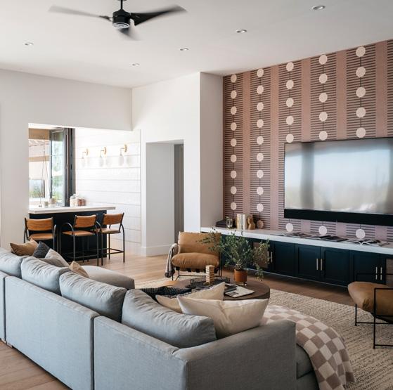 The goal for this project was to blend timeless style with Gatehouse’s current favorite materials, such as heavy textured boucles, tweeds and warm neutrals in a specific tonal color palette. “We also pulled inspiration from our home state of Utah with large mountains, beautiful valleys, and a strong emphasis on nature,” says the design team. This aesthetic, along with a few textural rugs, created the starting point from which the team selected their favorite Rowe and Robin Bruce frames, fabrics and casegoods, many of which are currently featured in their design projects and on the floor at their Gatehouse retail showroom. “The dark, moody color palette allows all of the lighter fabrics, wood tones and textures to pop off this deep background,” says the Gatehouse team, “while creating a warm and inviting space that draws you in to come in and stay a while.”