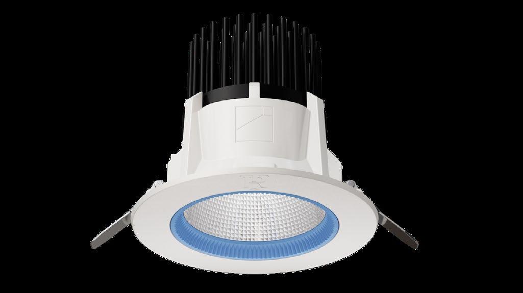 Seen here with a white embossed Retail Trust emblem and optional blue reflector ring, Colt Bio offers 71% reusable and recyclable components. It is a recessed fixed downlight available in outputs up to 27w and complete with increased efficiency COB LED module, reflector and remote electronic driver.