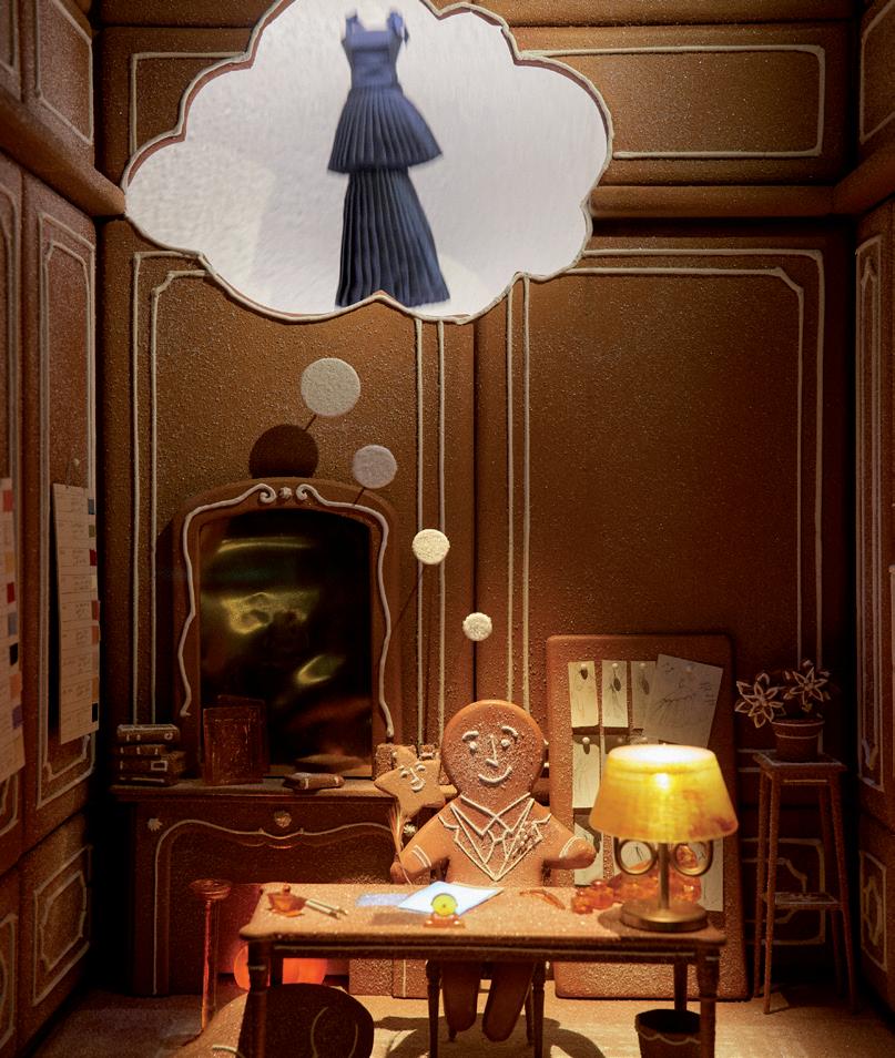 of a miniature 30 Montaigne was unveiled in an animated version, where Dior's classic silhouettes and accessories danced. As an enchanting surprise, certain emblematic dresses from Dior's patrimony – such as the Tourbillon, Soirée d'Asie and Junon models – were completely reinterpreted in confectionery and candy form. The Bar Jacket, the Lady Dior, the Dior Book Tote, and the Medallion chair – transformed by Philippe Starck and presented at the Salone del Mobile 2022 – were by turns spotlighted in the windows of the building.