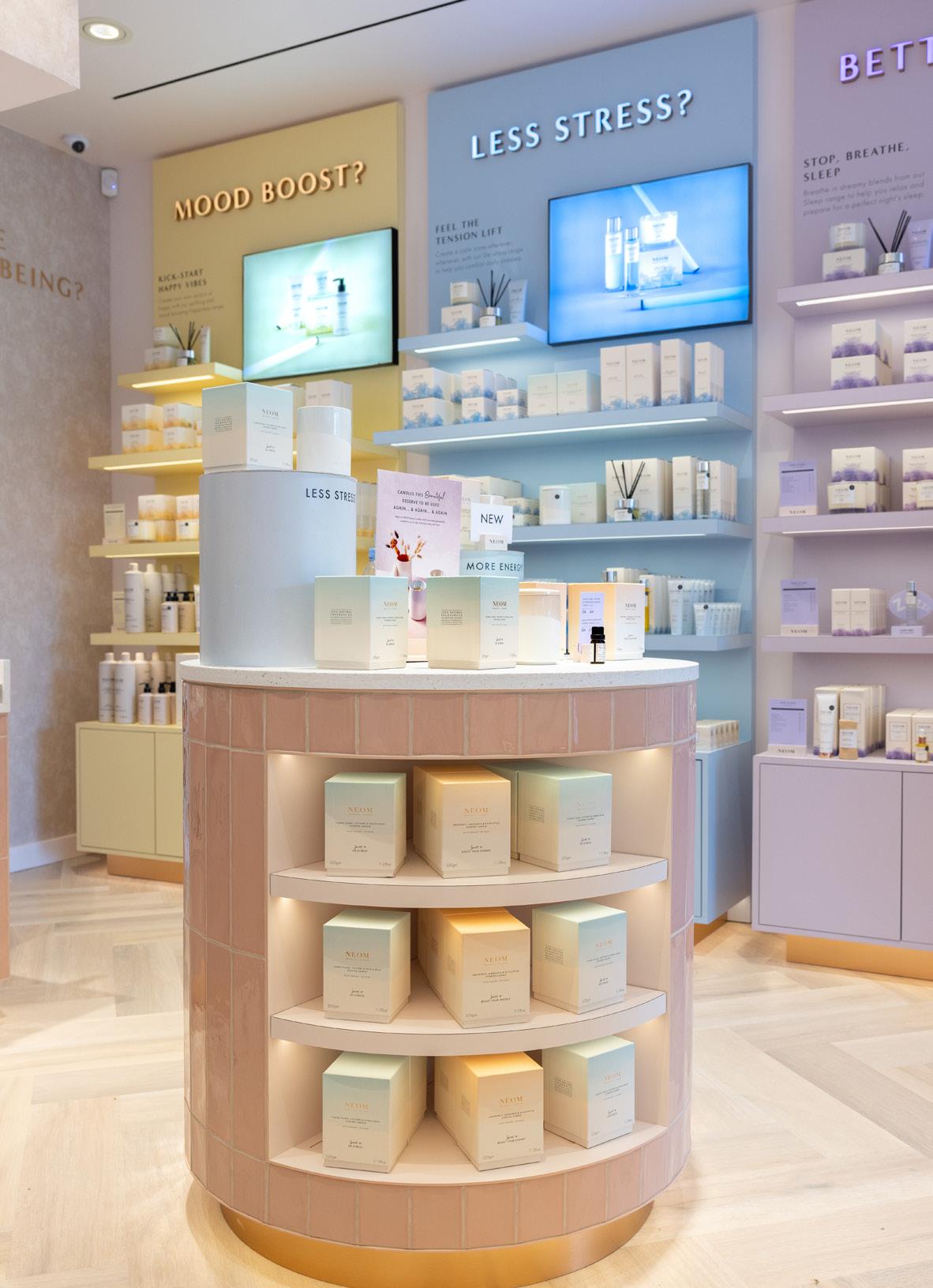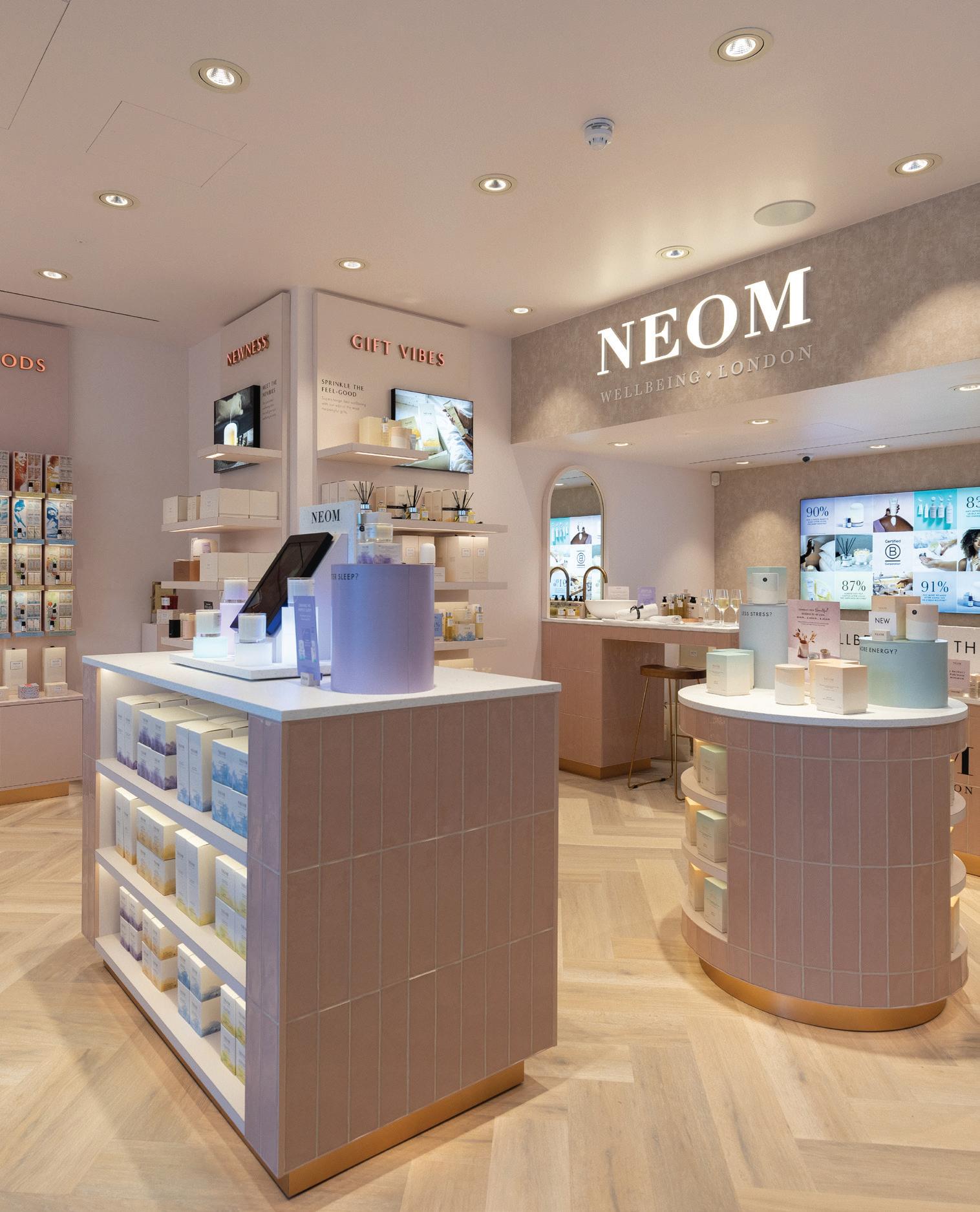 gold lettering enticing customers to their innovative and exciting new lines and the firm favourites felt worthy for gifting. Three additional blush pink freestanding display units grace the central floorspace and showcase seasonal product offers, as well as a travel range - mini products ‘for on the go’. These units, which are clad in blush coloured tiling, add a textural layer to this harmonious environment and are topped with classic clean white counters. However, the star of the show is the wellness bar at the rear of the shop, which is headed up with a large logo. Neom is depicted here in white on a mottled backdrop that brings another layer of texture into this delectable design. A clean white counter complete with stools, basin, tap and a mirror is where customers are offered complimentary hand and arm
