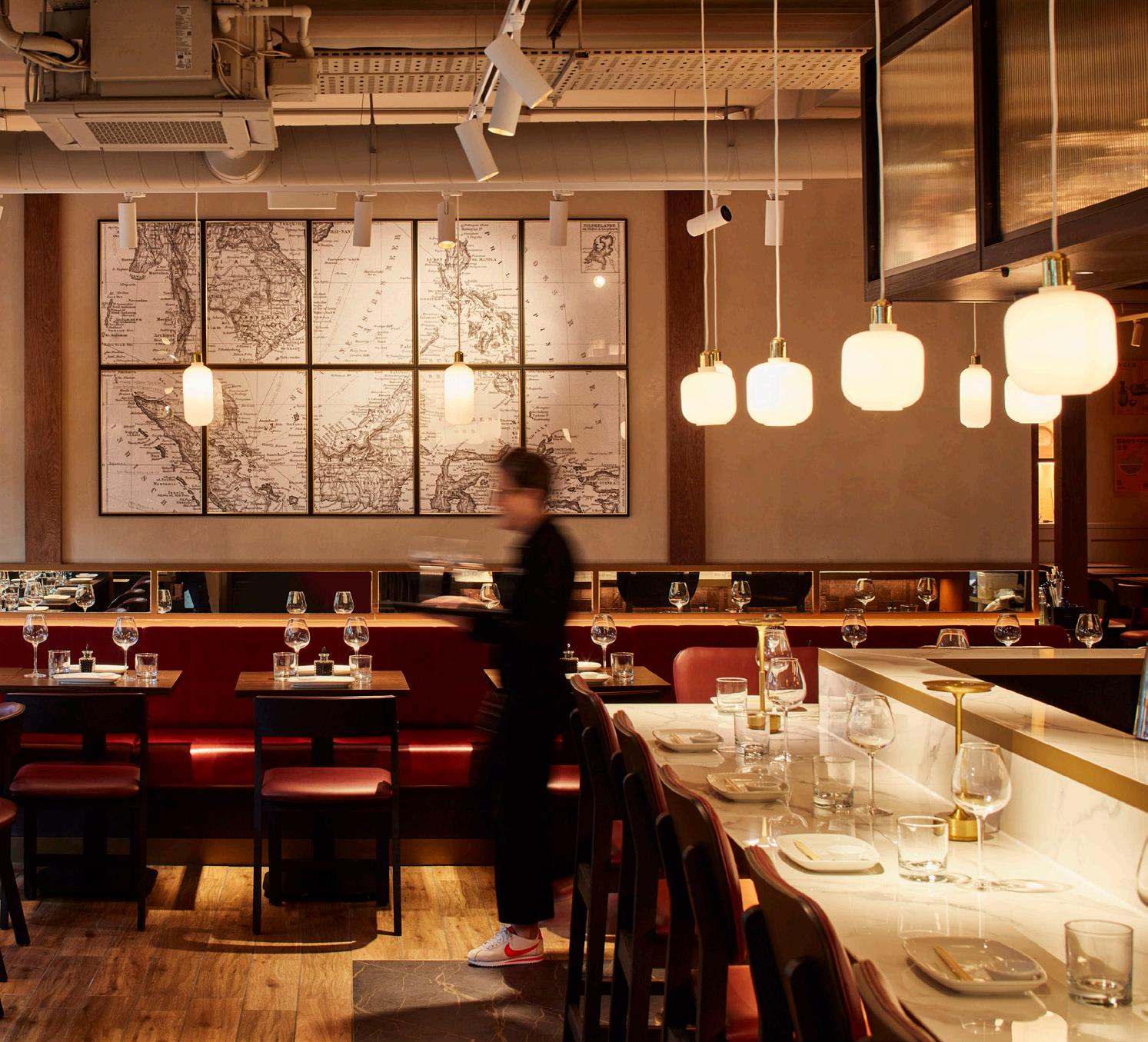 The remainder of the restaurant is filled with a selection of seating including comfortable banquet seating, small booths, window seats that can be fully opened up in summer and more discreet tables to the rear. Each area has a slightly different treatment, whether it be the lighting or the ceiling. The walls within the booth seating have been painted in a deeper tone and the wall sconces literally light up the wall so that you can almost feel the warmth radiating out. In the main dining sector at the front of the building, an enormous map of east Asia adds a dramatic element and acts as a nod to its sister branches.