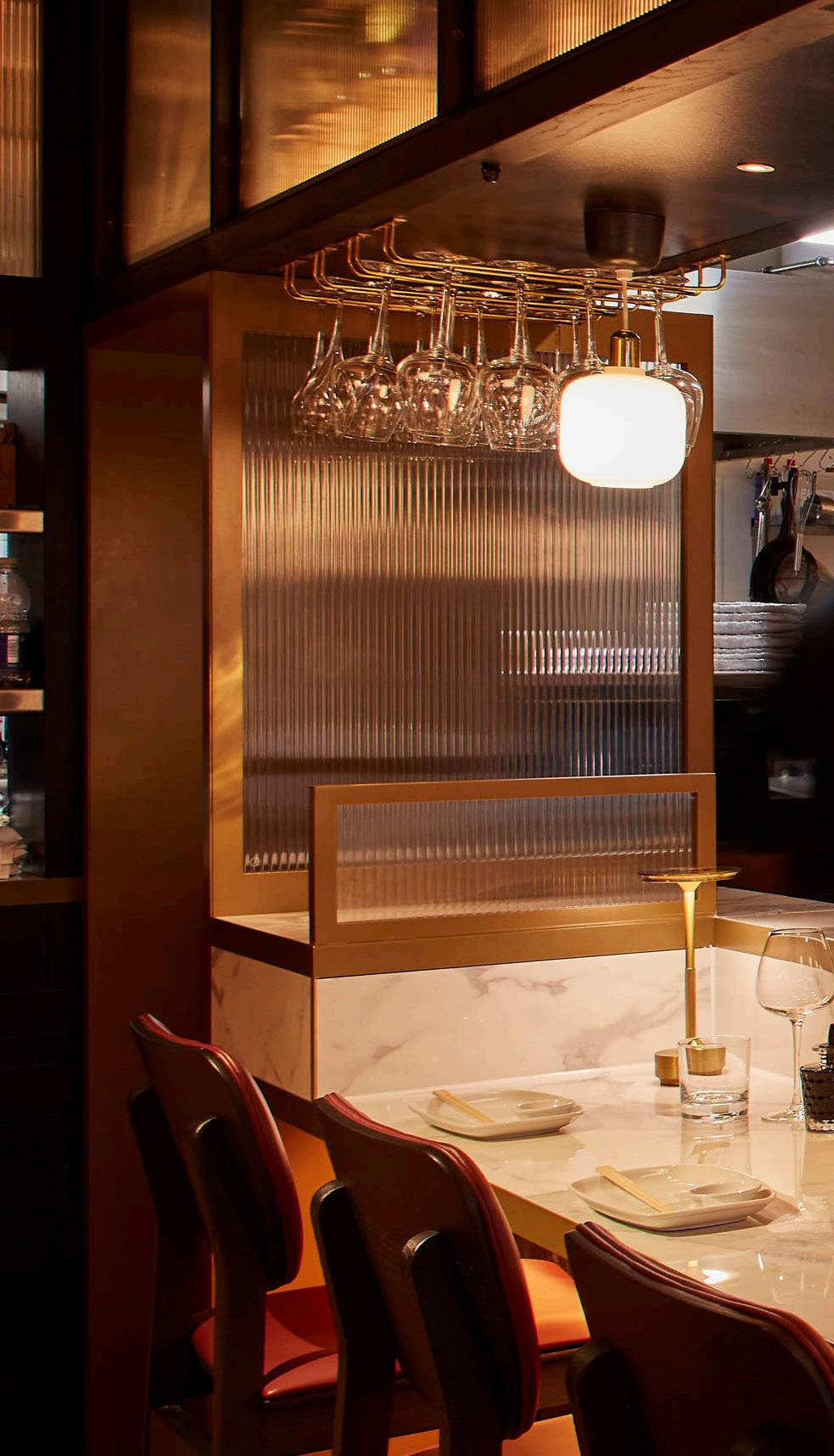 its impeccable surface, has been polished to perfection and creates an interesting contrast to its rustic counterpart. Here, diners can perch on a bar stool close to the action and watch mixologists devise ingenious cocktails and chefs in the semiopen kitchen bring further drama to the scene. There is a separate dining space for larger groups and, or celebratory dinners and lunches that is accessed through double doors at the rear of the premises. Floor to ceiling, open shelving either side of the doors allow views into the room but also provides a screen from the main dining floor. Origami style, silk lanterns are suspended over the enormous, handcrafted, timber table. The seats and backs of the individual chairs are covered in the brand’s signature red. The shelves are dressed with pieces of Japanese art and pottery, whilst the walls are hung with Japanese prints.