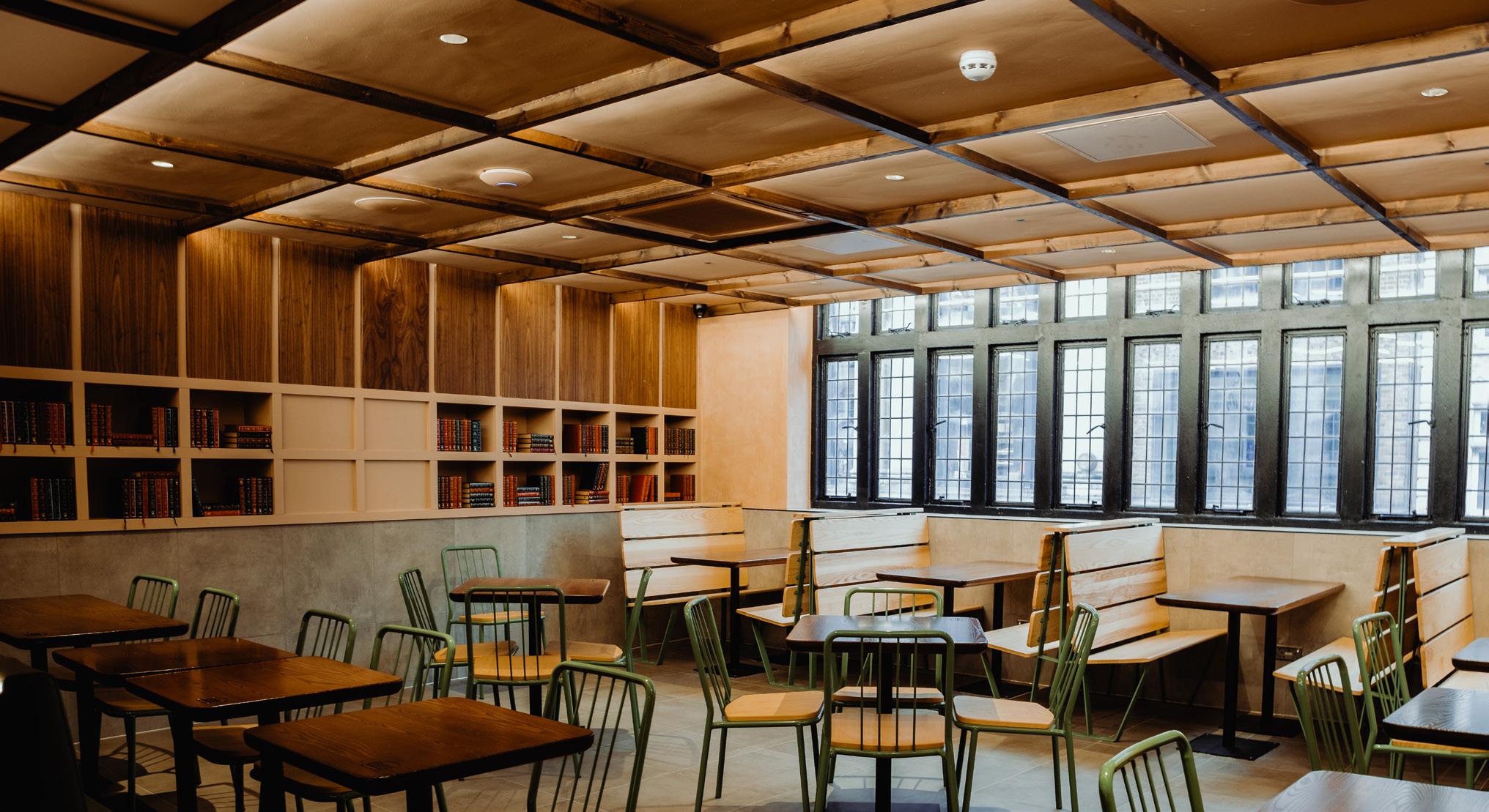 with booth style seating and is complete with wall textures to represent the books’ silhouettes. Whilst the tables and chairs remain the same as on the lower level, the bench seats have bare, wooden slats. The side walls have also been lined with book shelves and have been interspersed with recesses and mirrors. Wood panelling has been applied to the walls above the shelving and concrete screed has been applied below.