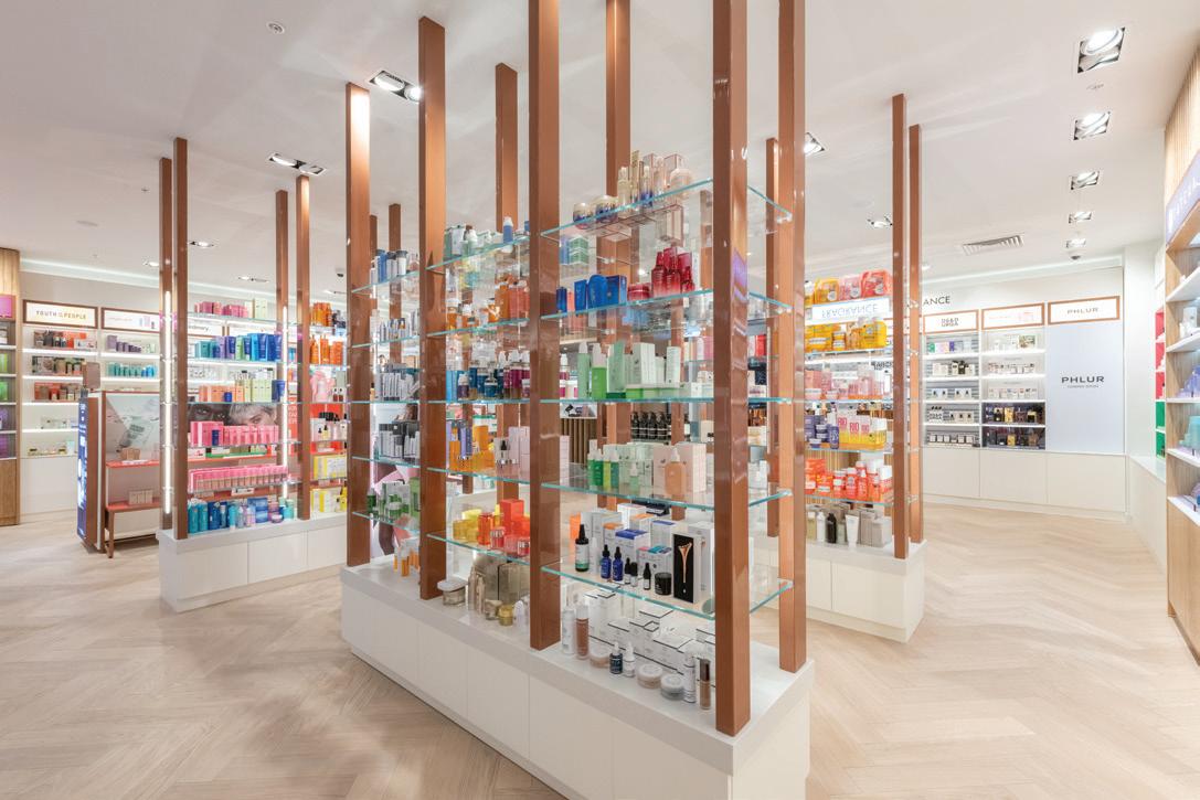 As you enter through the doors, the concept comes into view. Along the right side, perimeter wall shelving units showcase the four brand pillars in greater detail. Each cabinet and its shelves have been painted in the corresponding soothing shade to match the product; soft green for more energy, relaxing lilac for better sleep, light blue for less stress and lemon yellow for mood boost. The subtle hues of the units blend with the delicately coloured packaging and together create a cohesive appeal. Each shelf is crammed with product, rigorously aligned in regimental rows. The tonal colour scheme helps the customer to navigate the brand, as well as the store.