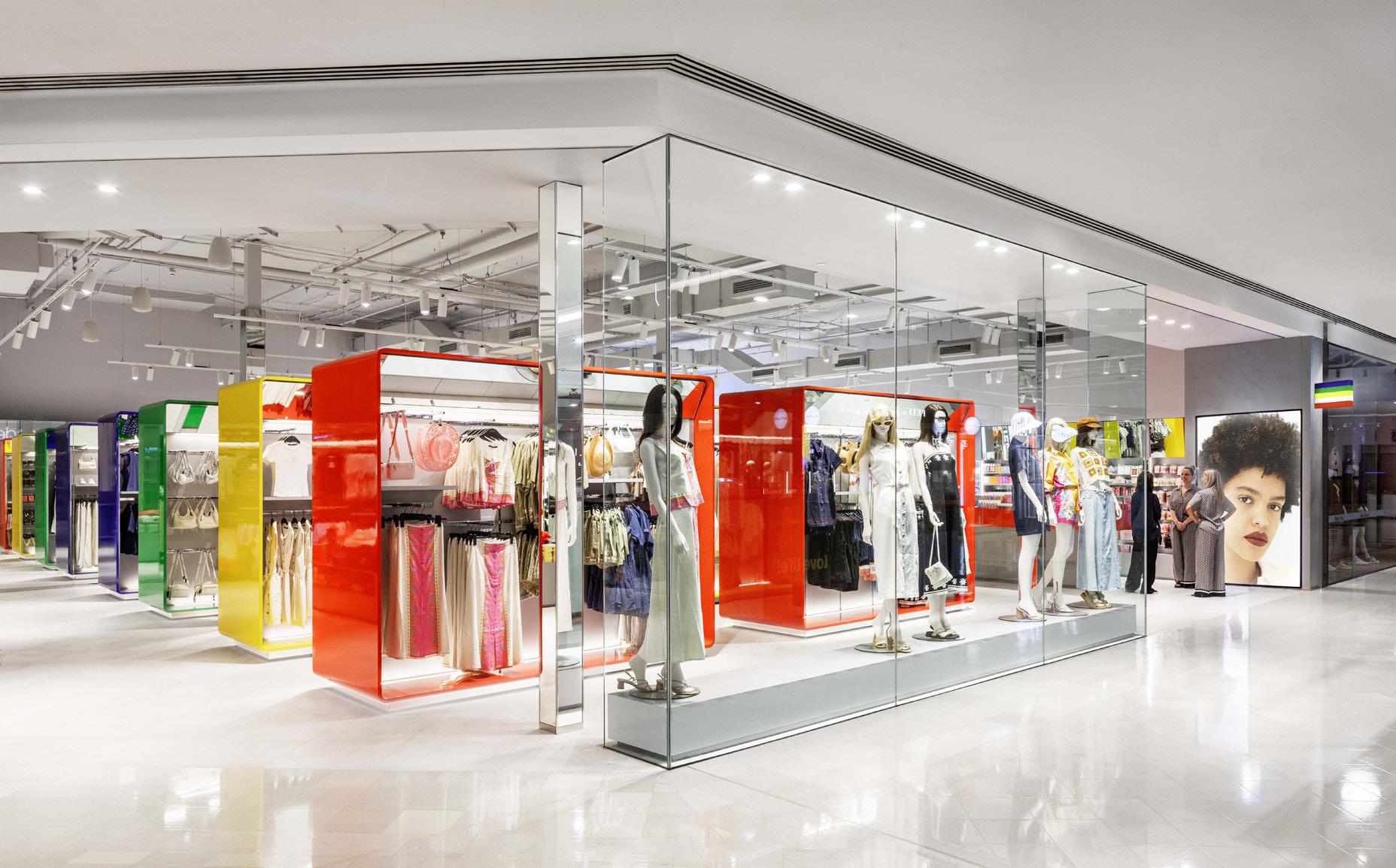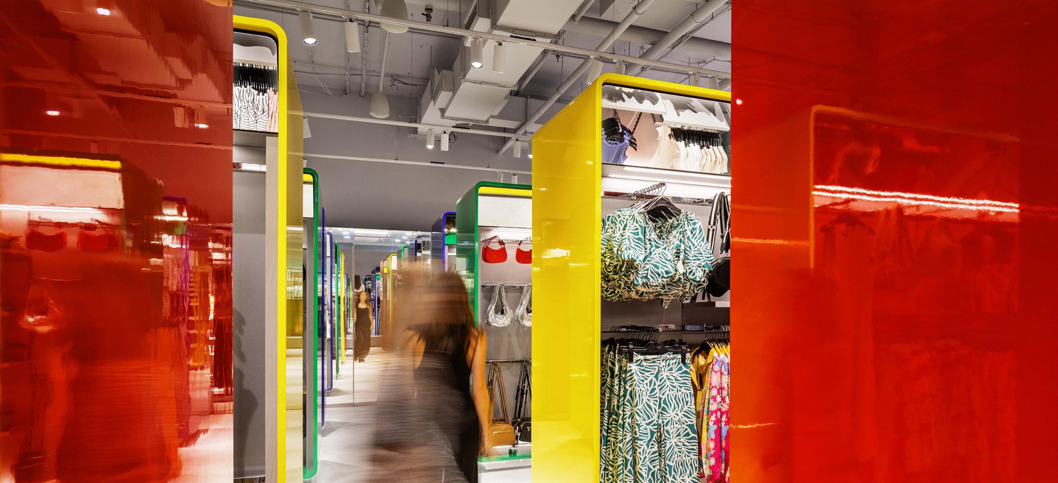 Taking inspiration from the brand’s iconic heritage stripes, the store is divided up by what appear to be huge swathes of colour, that are actually enormous individual ‘walk in wardrobe’ display cabinets. The units have been developed specifically to showcase the retailer’s full range. The store’s equally expansive fully glazed open shop front invites you into the vast space, where the rainbow screens cascade through the interior and vie for your attention. It is a phenomenal sight and it is without doubt the shop design