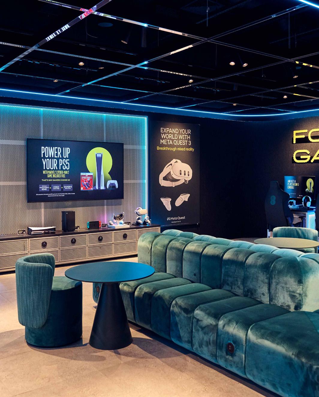 store, allows customers to play up to date games in real time at a series of cutting-edge consoles. Funky illuminated wall-mounted pegboard is used to display gaming accessories and other related merchandise. The comfy sofas in this zone, which are upholstered in rich, plush velvet, provide the opportunity to relax and learn about the bundles and plans available for the avid gamer. Basecamp takes up the main floor space to enable relaxation and learning; seating arranged in groups, stylish workbenches equipped with bar stools and gleaming worktops to serve beverages fill the area. Large digital screens complete the set. You can catch up on your emails, grab a quick cuppa or converse with sales staff regarding the products, or service and repairs.