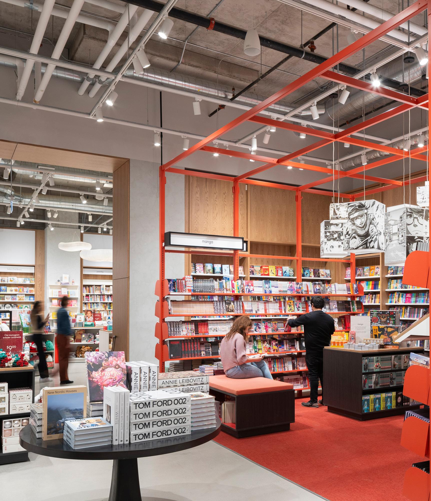 are immediately absorbed into the centre of the stage. The linear bookshelves frame the scene as the individual room sets pop all around. The boldness of the orange angular freestanding display structure, where the Manga books and its complementary produce reside, captures your eye on the right side. Whilst the equally vibrant retro coffee truck serving coffee, tea, snacks, beer and wine vies for your attention and is sited on the left side of the store. The sky blue beverage truck is surrounded by the books; café style tables and chairs are provided to encourage customers to dwell. A full length decorative bookcase is positioned at the rear of the store to display seasonal gifting and draws your eye over the entire shopfloor.