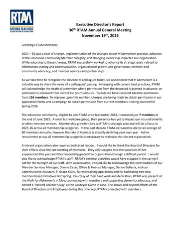 A vibrant organization also requires dedicated leaders. I would like to thank the Board of Directors for their efforts since the last meeting of members. They ably stepped into the vacancies RTAM experienced this year and their leadership guided the organization through a difficult period. I would also like to acknowledge RTAM’s staff. RTAM’s external activities would have stopped in the spring if not for the strength of our staff. With appreciation, I would like to acknowledge the contributions of our Member Services Manager, Dianne Casar, Office & Finance Manager, Denise Bellesia, and our Administrative Assistant, F. Grace Kilani, for maintaining operations and for facilitating two new member-based initiatives last Spring. Courtesy of their hard work and dedication, RTAM was present at the Walk for Alzheimer’s in May, connecting with members and supporting dementia advocacy, and hosted a ‘Retired Teacher’s Day’ at the Goldeyes Game in June. The above and beyond efforts of the Board of Directors and Employees during this time kept RTAM connected with members.