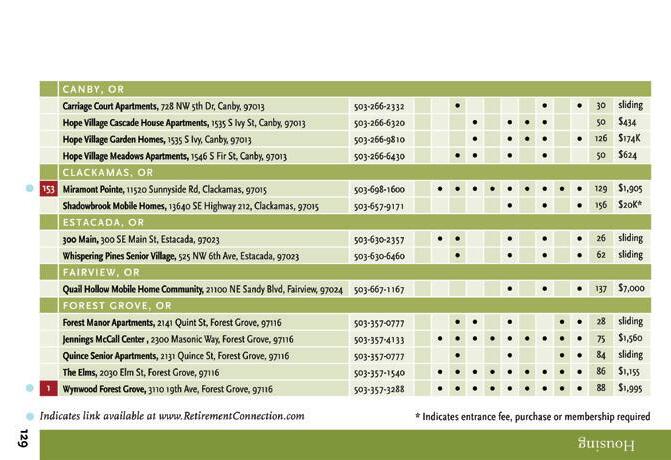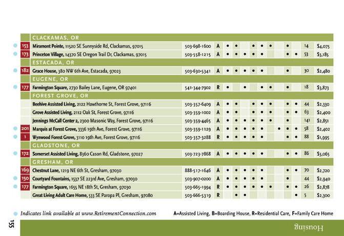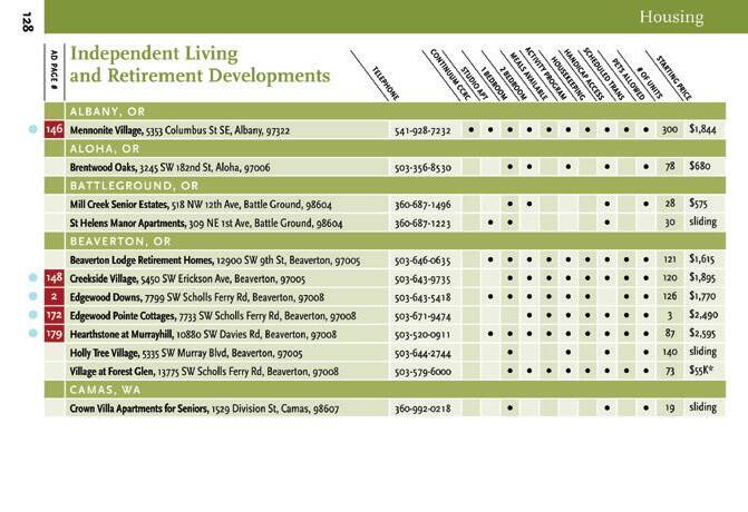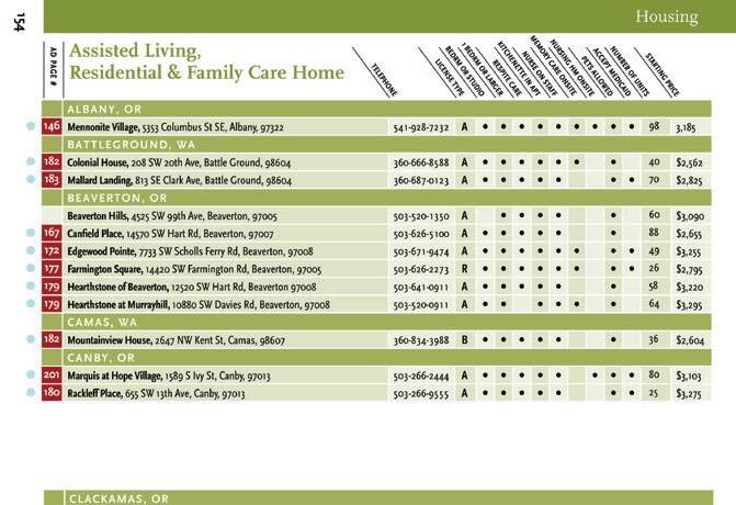 Begin by reviewing the Housing Definitions at the beginning of the section to determine which level of care best fits your needs. Then turn to the easy to read comparison grids; which are separated into 4 primary care levels: Independent Living, Assisted Living/Residential Care, Memory Care & Skilled Nursing/Intermediate Care. The communities are separated by city so you can quickly search a specific geographic area.