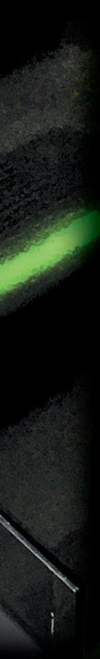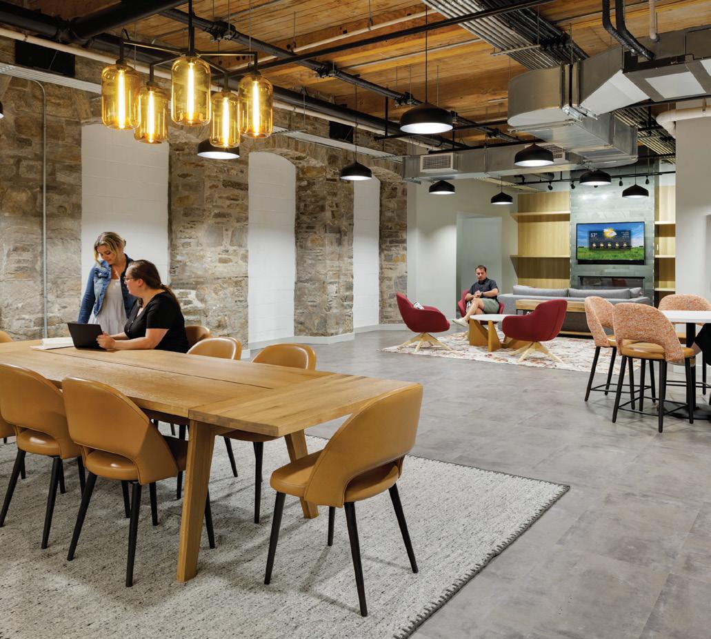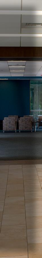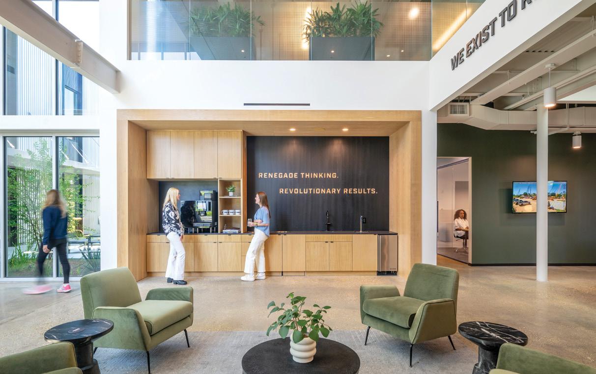 multipurpose space with an adjacent boardroom that is open to all tenants. With its double-height ceilings and open views to the campus on the north and east sides, the Collab can accommodate a variety of seating options in a luxurious atmosphere. It serves as a welcoming gathering place, softened by cascading vines and warm-wood elements and enlivened through color and selective use of inspirational neon.