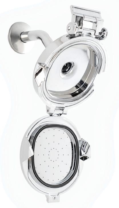 The dark, damp chamber inside traditional showerheads is a breeding ground for mold, mineral buildup and bacteria that can turn into an invisible mist each time a person showers. ShowerClear is a patented showerhead that solves this overlooked problem with a simple design. With the press of a latch, the ShowerClear showerhead’s faceplate swings open like a book, allowing trapped water to drain completely and fresh air to circulate and dry the channels and surface before the next use. The ShowerClear showerhead hand-tightens onto any standard 1/2-inch shower arm in less than five minutes. At 5 1/2-inches across, the showerhead delivers a federally compliant 2 1/2-gallon-per-minute flow rate with an optional 1.8-GPM restrictor available for regions with low-flow requirements. Four designer finishes—brushed gold, brushed nickel, chrome and matte black—complement any bathroom aesthetic. shopshowerclear.com